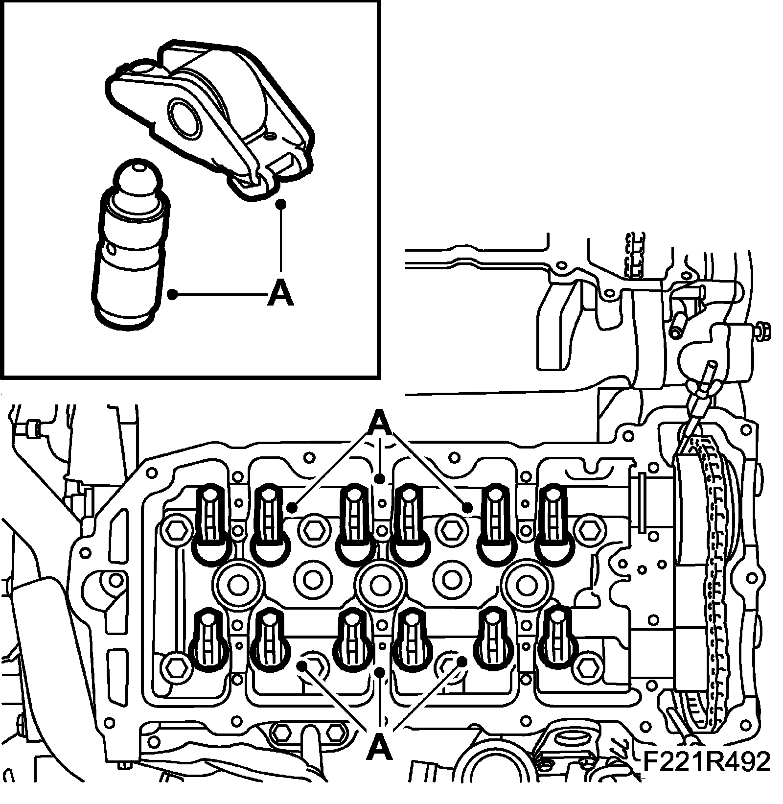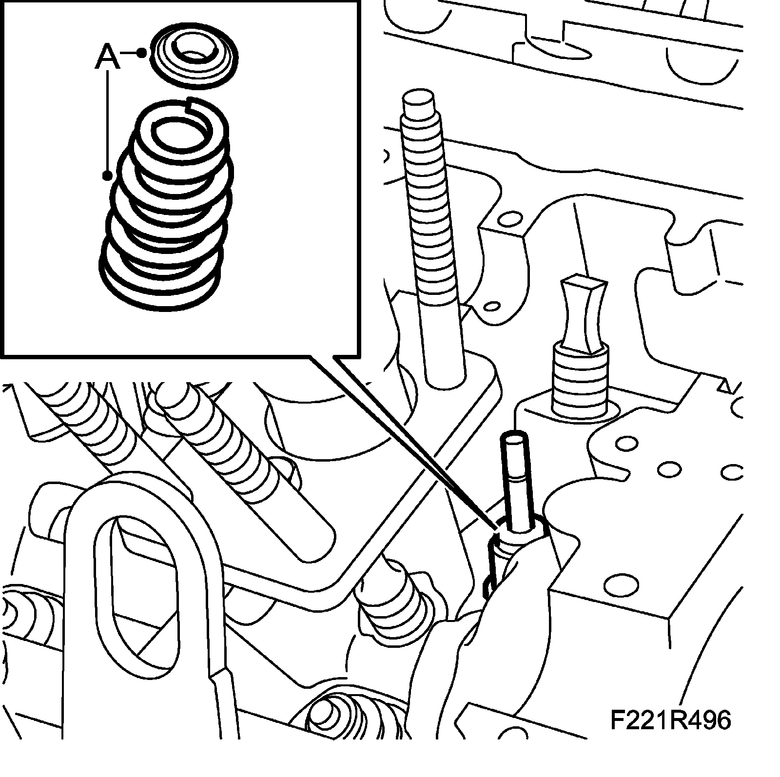23. Lift out the spring plate and valve spring (A).