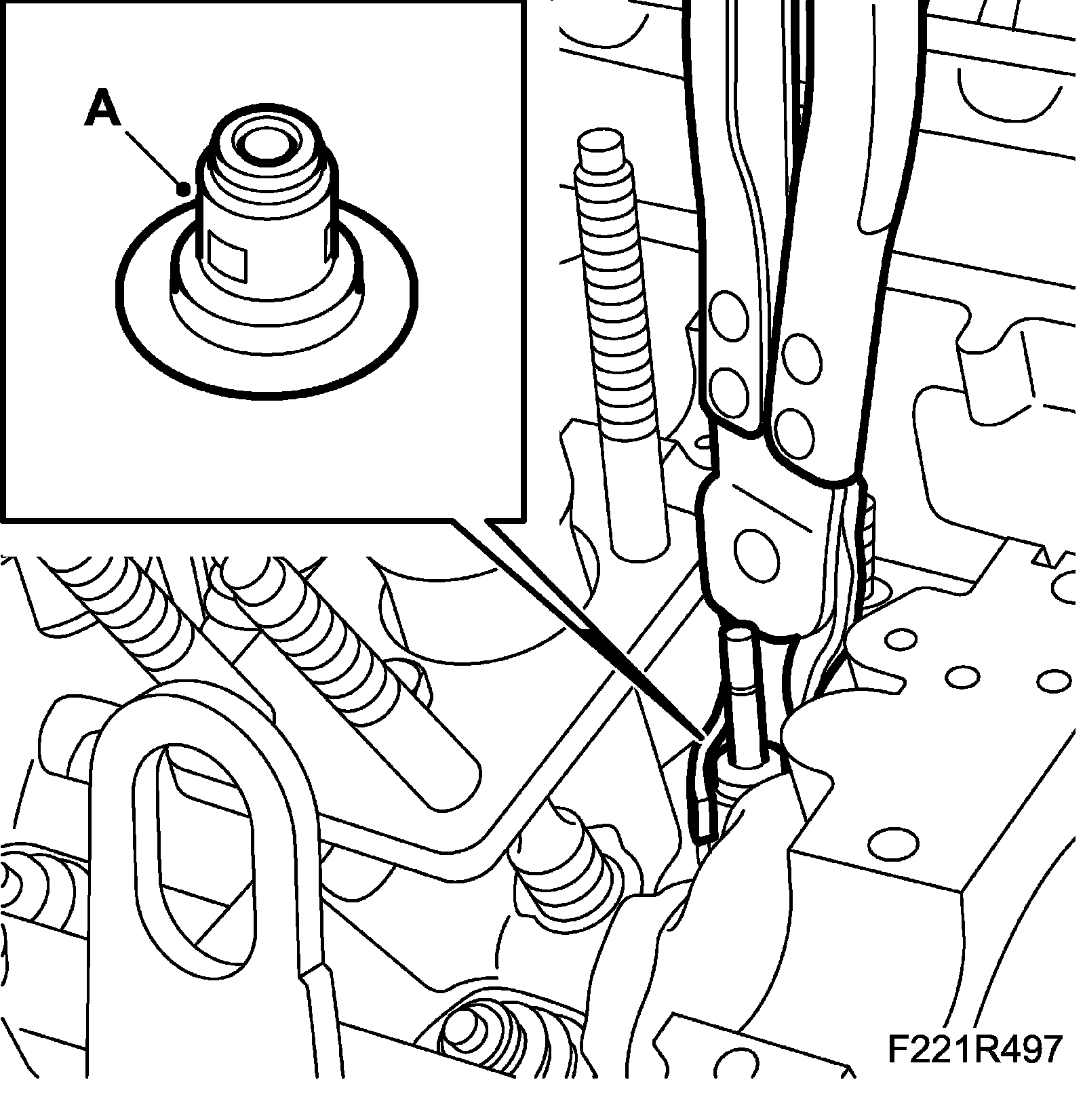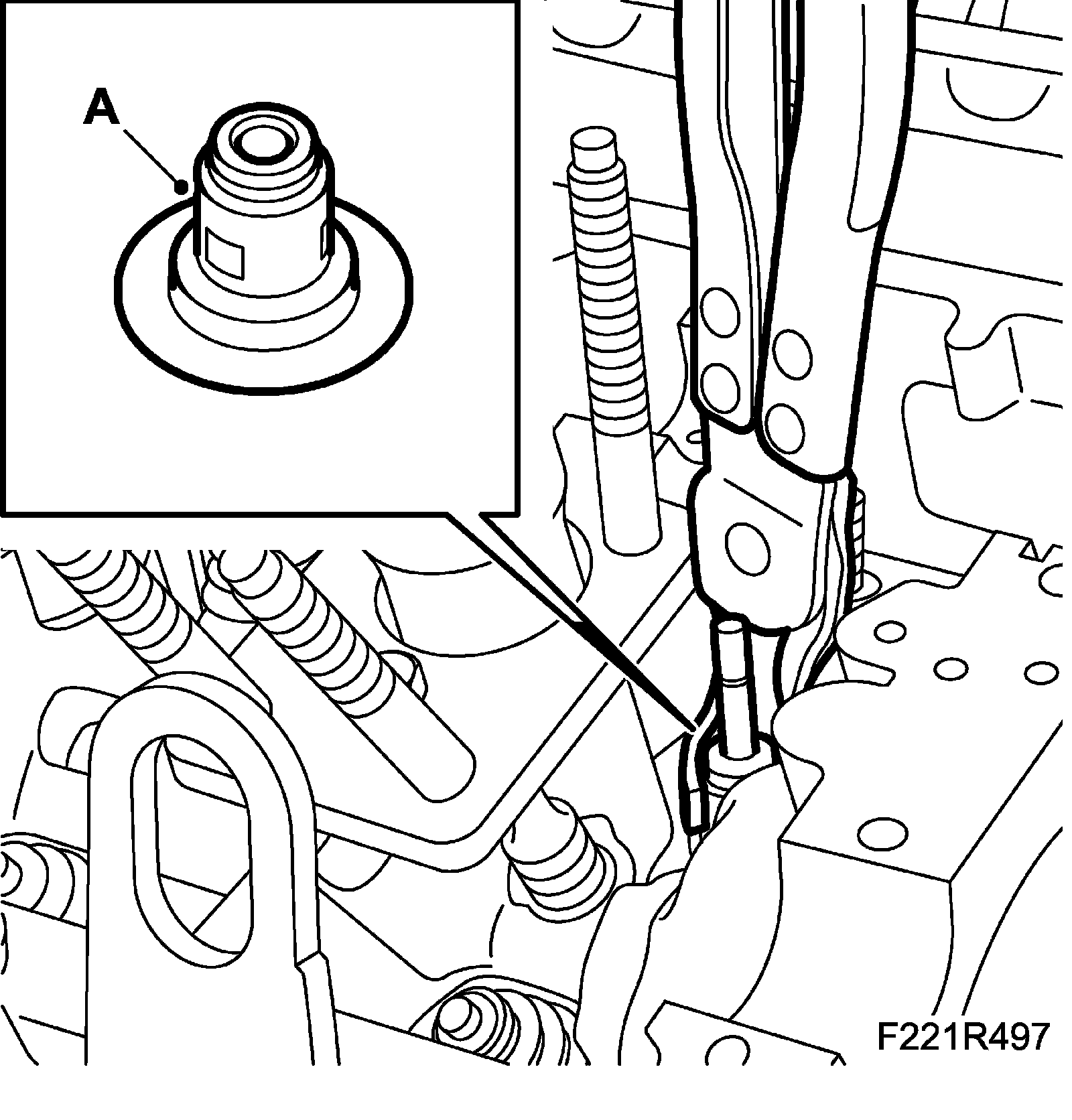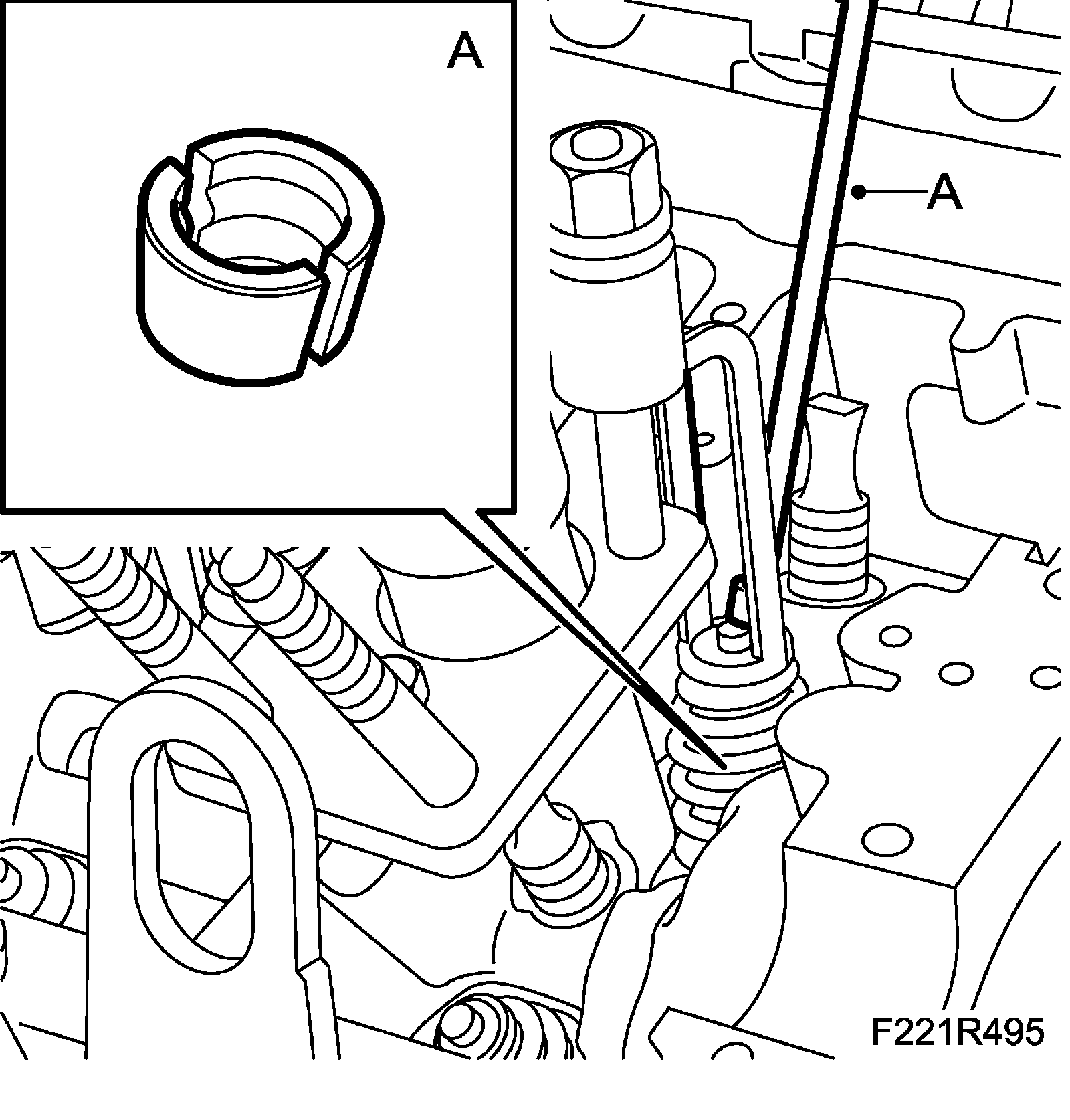 15. Fit the camshaft solenoid valve (695R) using a new seal (A).