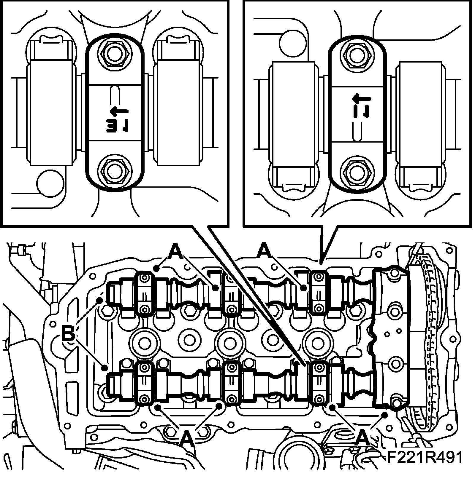 17. Lift out the camshafts and note the rear marking on the camshafts. (B) The last letters in the marking: RI = intake camshaft, rear cylinder bank. RE = exhaust camshaft, rear cylinder bank.