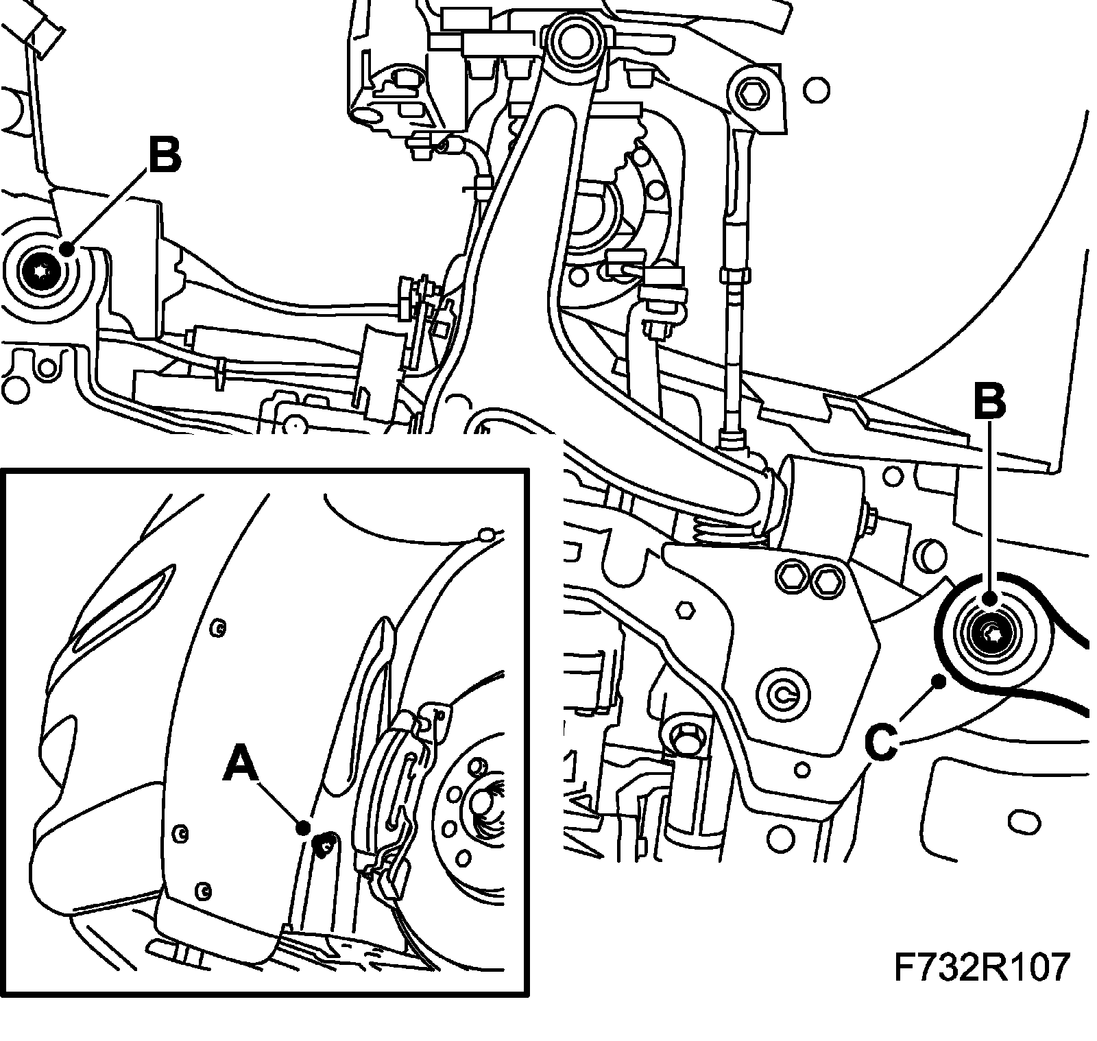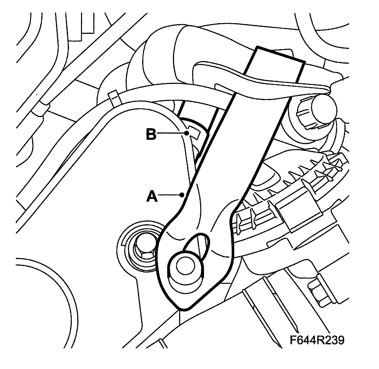 14. Remove the bolts (B) securing the rear torque arm to the subframe. Remove the cable tie from around the return line.