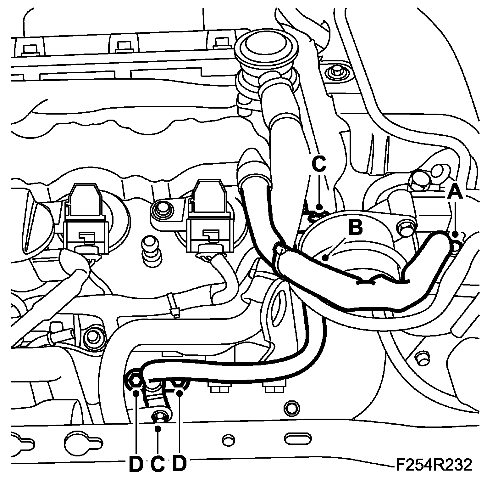 5. Fit the crankcase ventilation hose (B) to the turbocharger and m the bolt (A).