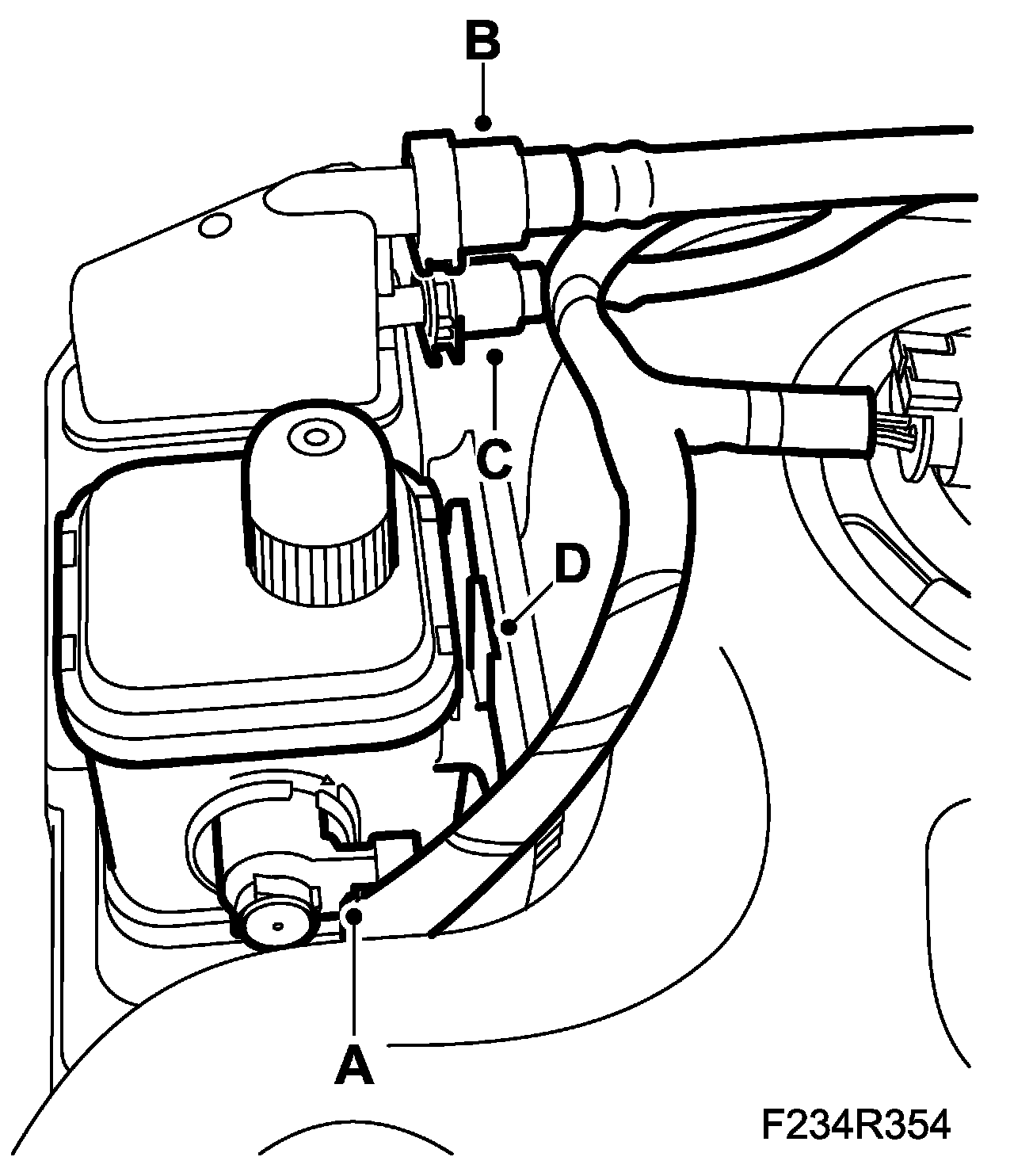 1. Raise the carbon canister, plug in the connector (A) and attach the two hoses (B) and (C).