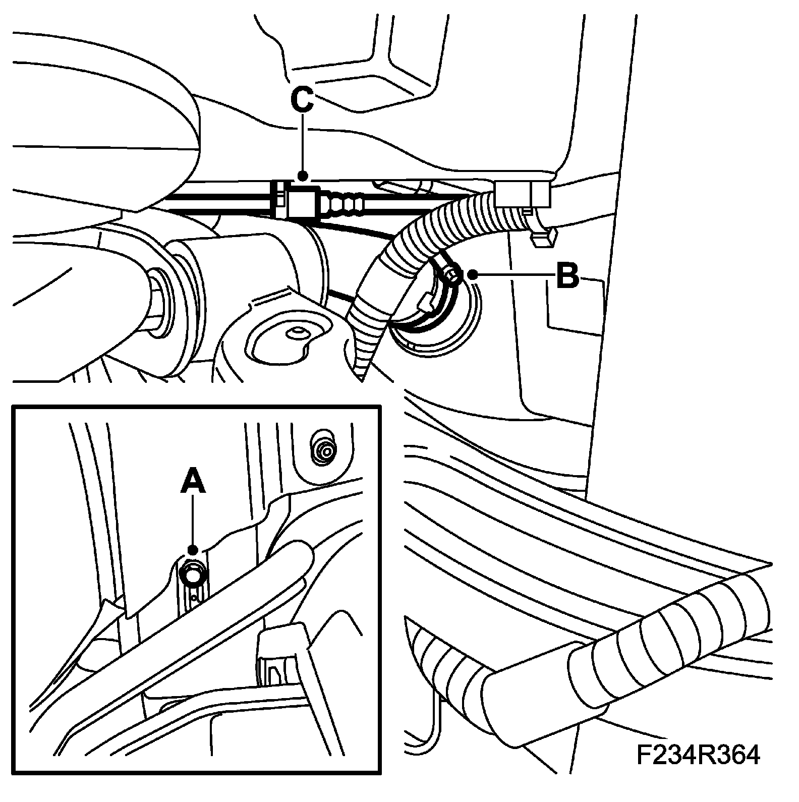 1. Attach the filler pipe hose and tighten the hose clip (C). Fit the bleeder hose quick coupling (C) and fit the bolt (A).