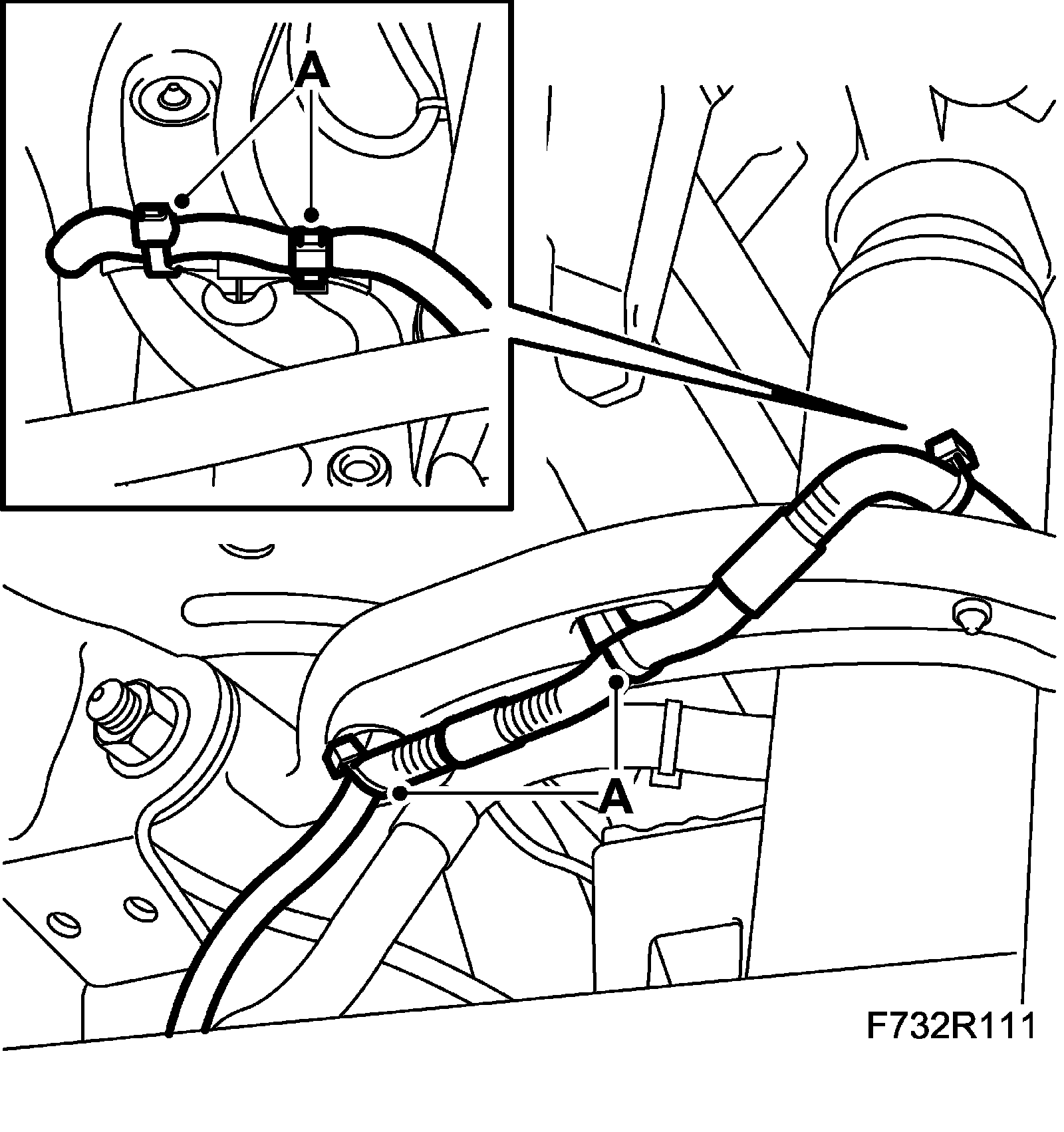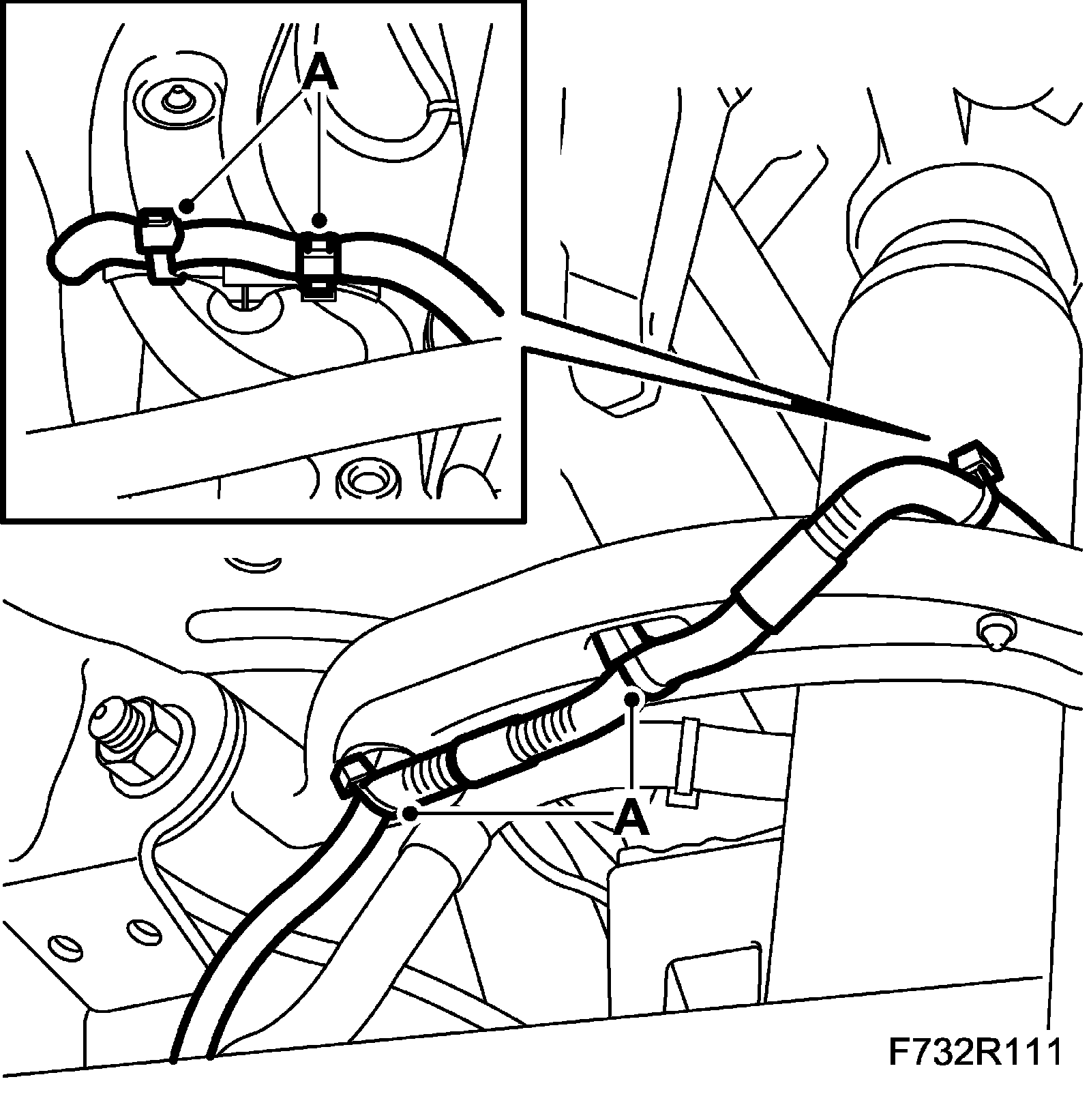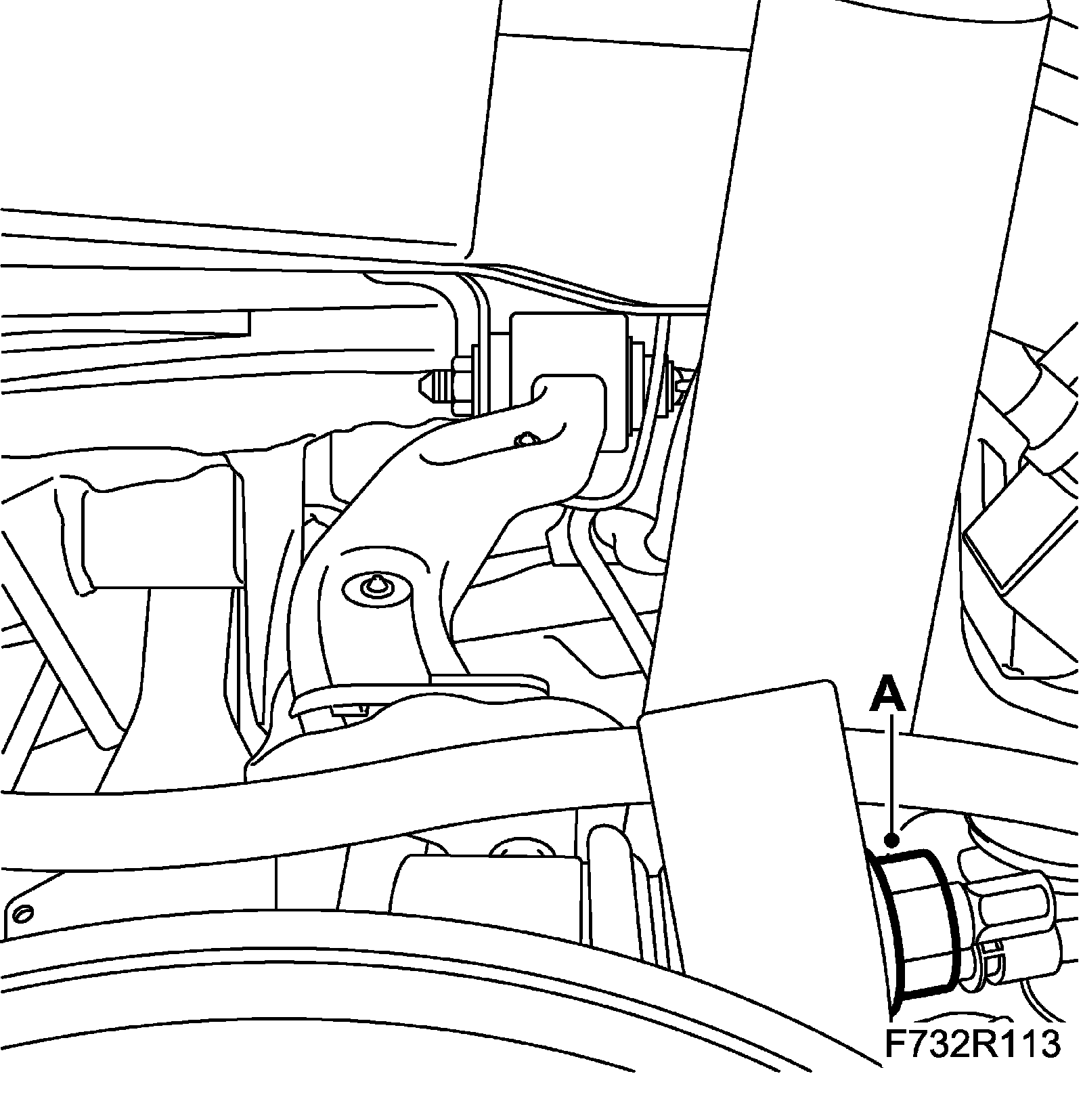 6. Fit the wheel sensor wiring harness (A) to the upper suspension arm.