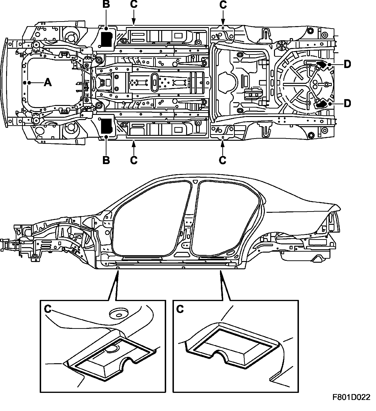 1. Raise the car. use the rear jacking points C and the front jacking points B, see Jacking and attaching points.