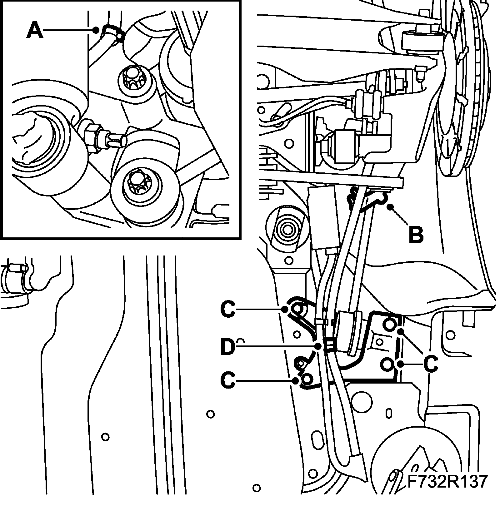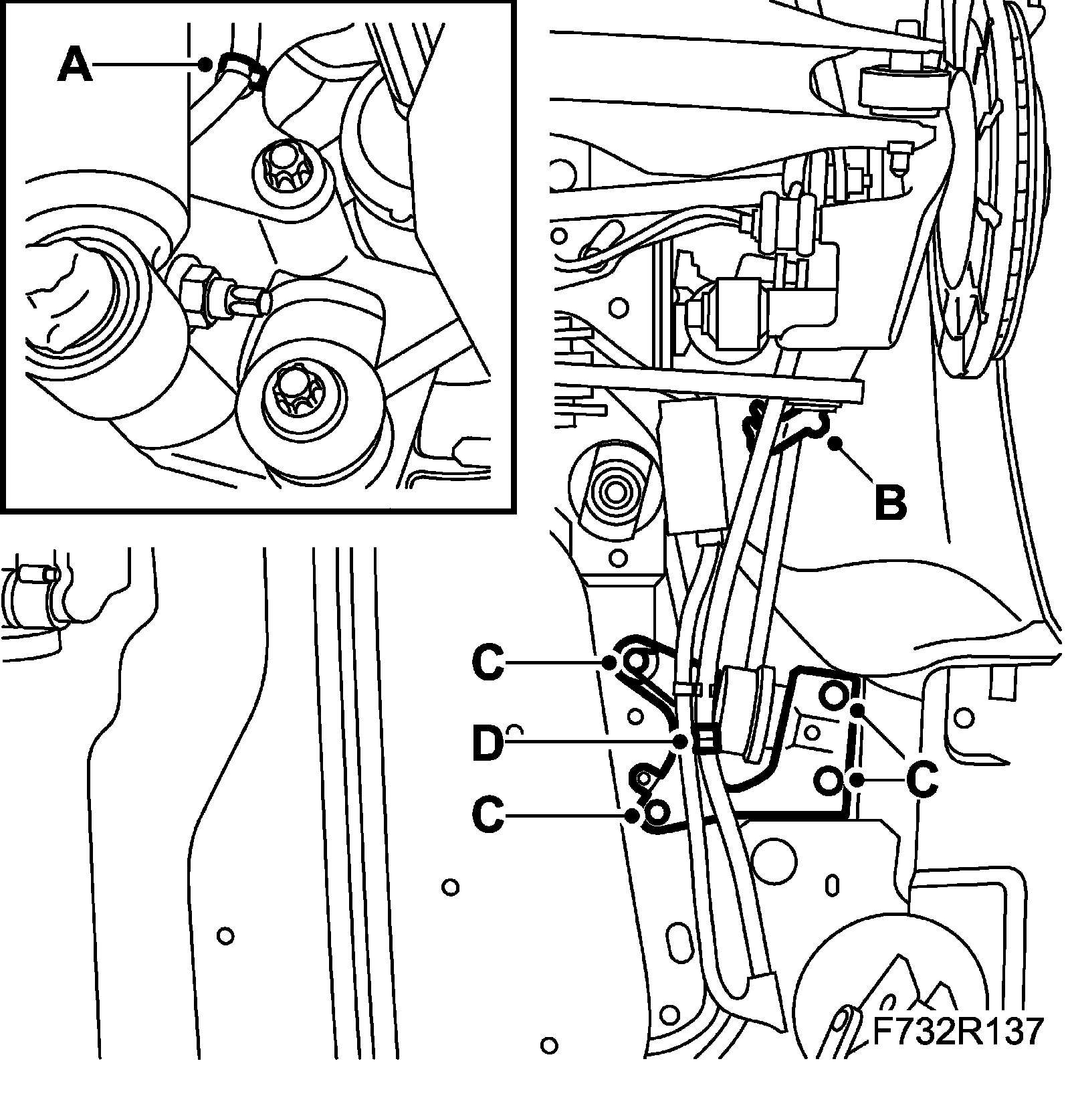 5. Remove the front mounting (C) of the longitudinal link and detach the parking brake cable holder (D) from the mounting.