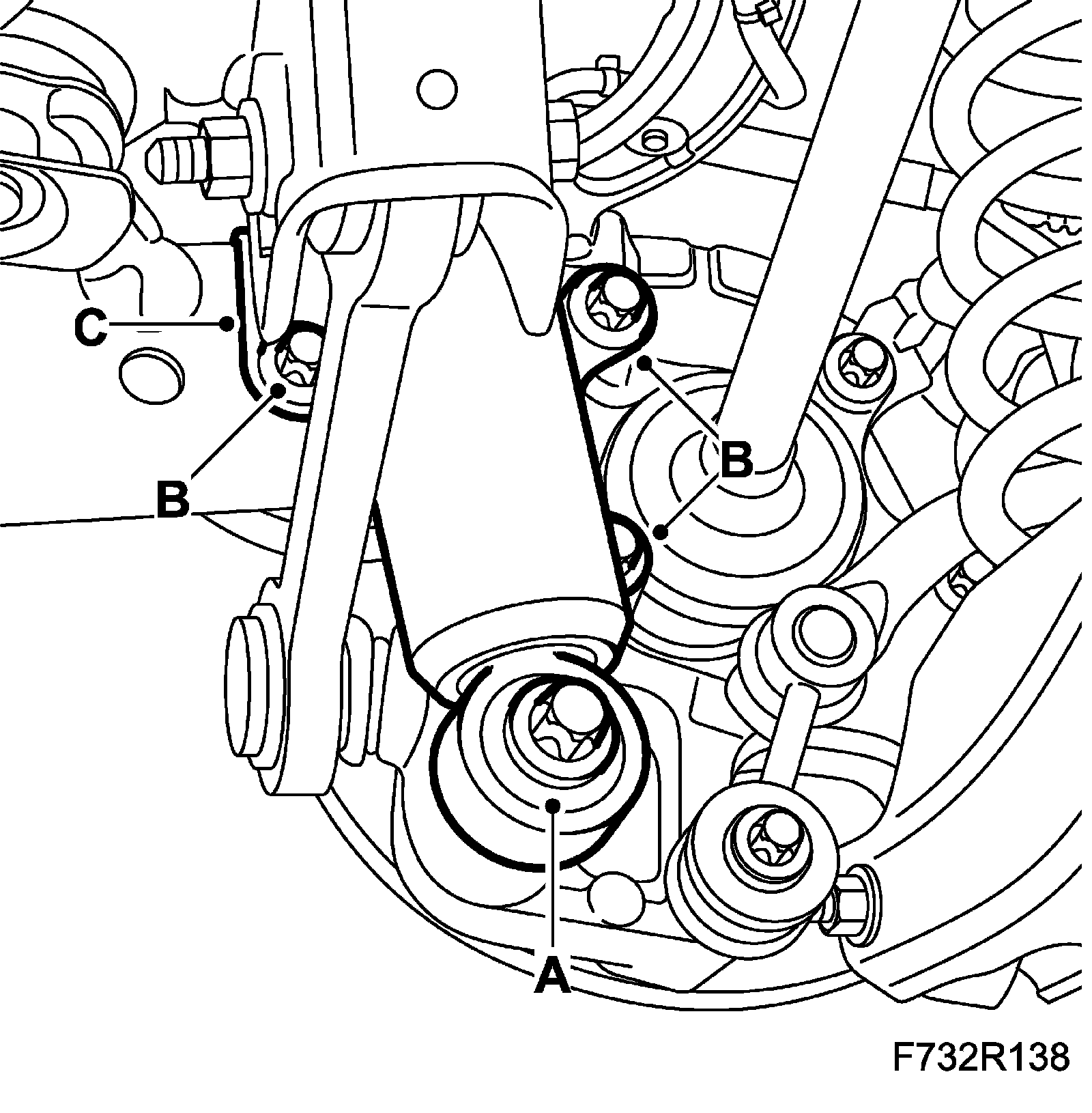 7. Remove the bolts (B) holding the longitudinal link to the steering swivel member. At the same time, detach the holder of the wheel sensor connector (C).