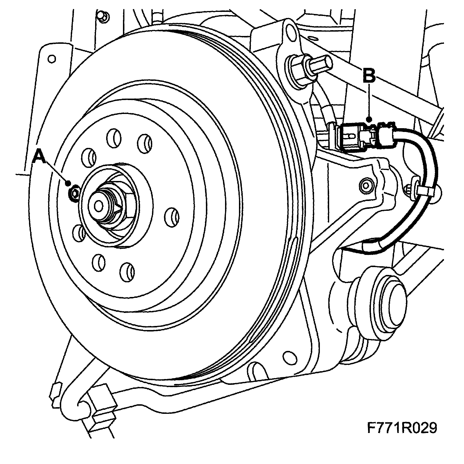 8. Unplug the wheel sensor connector (B).