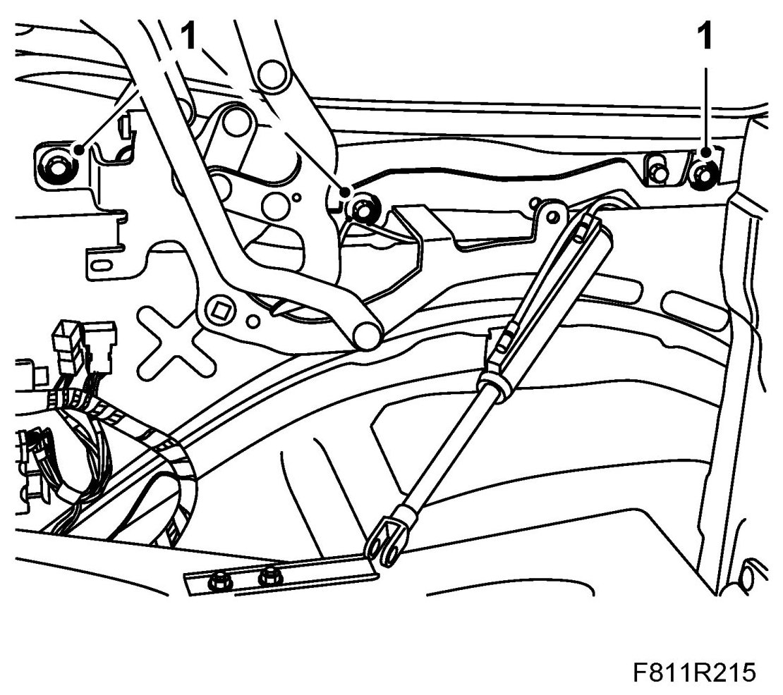 1. Place the soft top cover hinge in mounting position so that the rear bolt is in the same position as before removal. Fit the bolts for the soft top cover hinge.