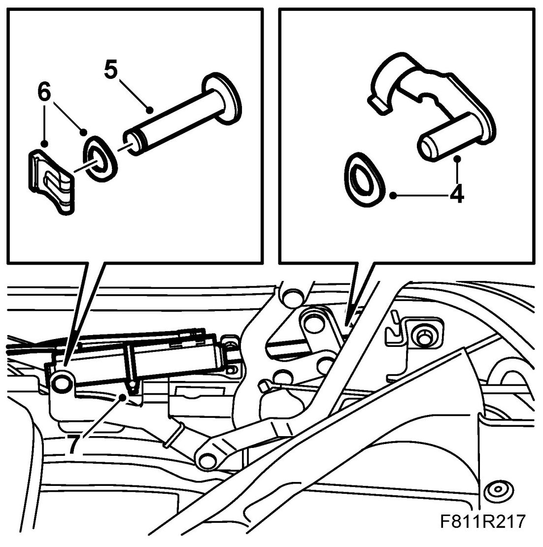 5. Fit the retaining pin for the hydraulic cylinder to the soft top cover hinge. Note the accompanying washers.
