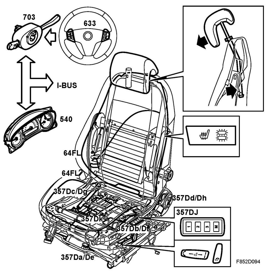 - Electrically adjustable driver's seat with memory, legroom adjustment position sensor, (357De)