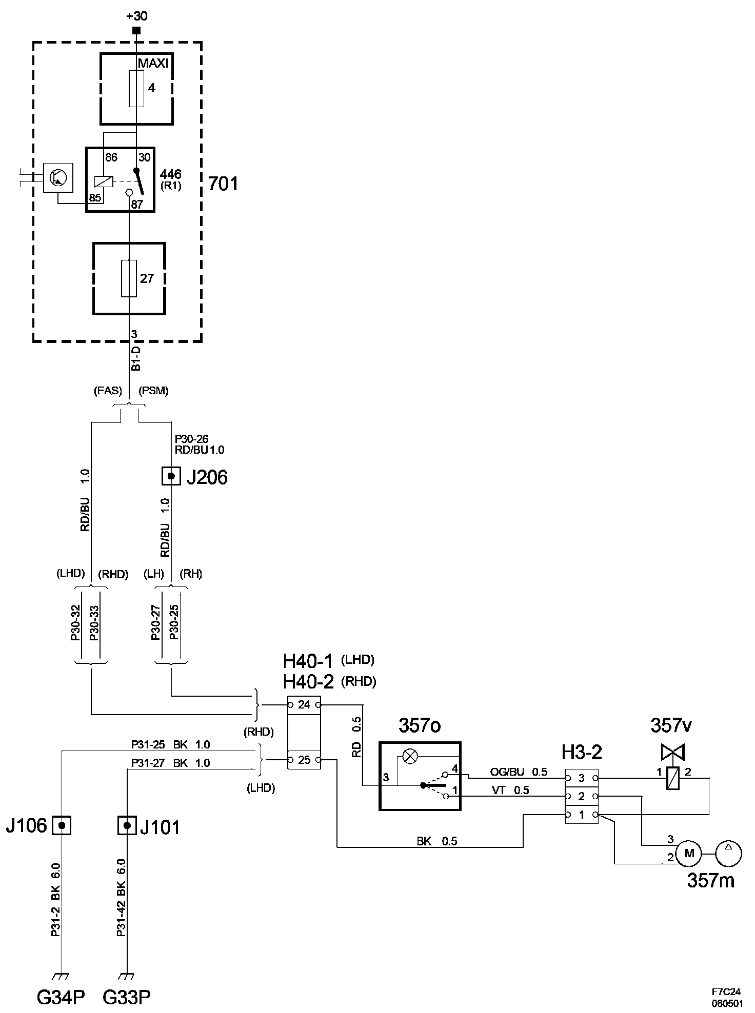 The diagrams for the power supplies that may be feeding this system (+30, +15, +54, +X, and +B) ) can be found at Power and Ground Distribution diagrams.