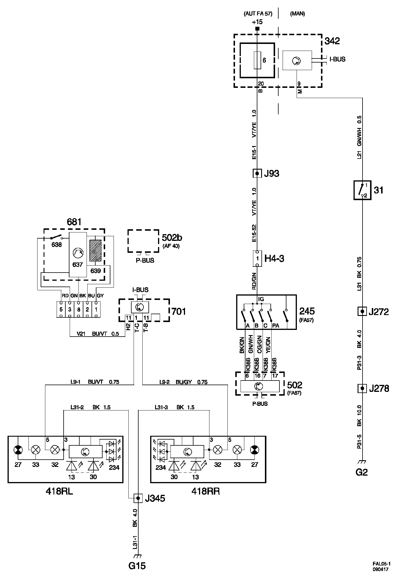 The diagrams for the power supplies that may be feeding this system (+30, +15, +54, +X, and +B) ) can be found at Power and Ground Distribution diagrams.