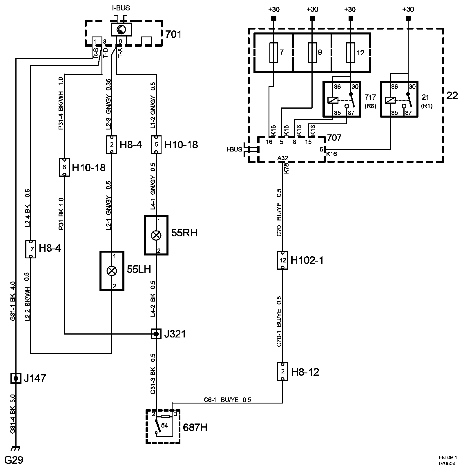 The diagrams for the power supplies that may be feeding this system (+30, +15, +54, +X, and +B) ) can be found at Power and Ground Distribution diagrams.