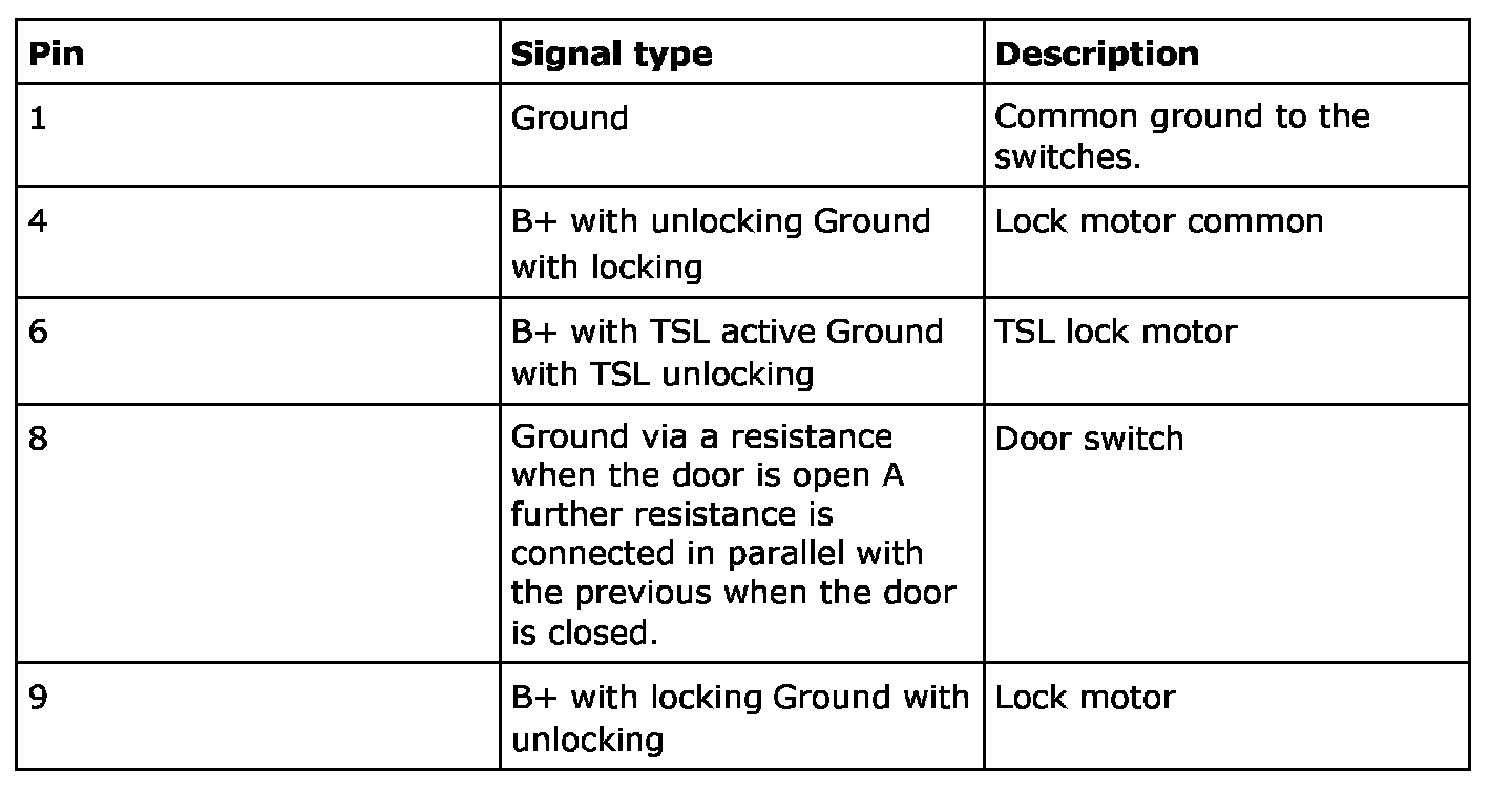 The switch has a ground and a signal lead connected to the door module. The door module feeds the switch with B+ via a resistor integrated in the control module. For the door the resistance is 100 kohm. The control module input is digital. A voltage greater than 2V is interpreted as an open circuit, and lower than 2V as a closed circuit.