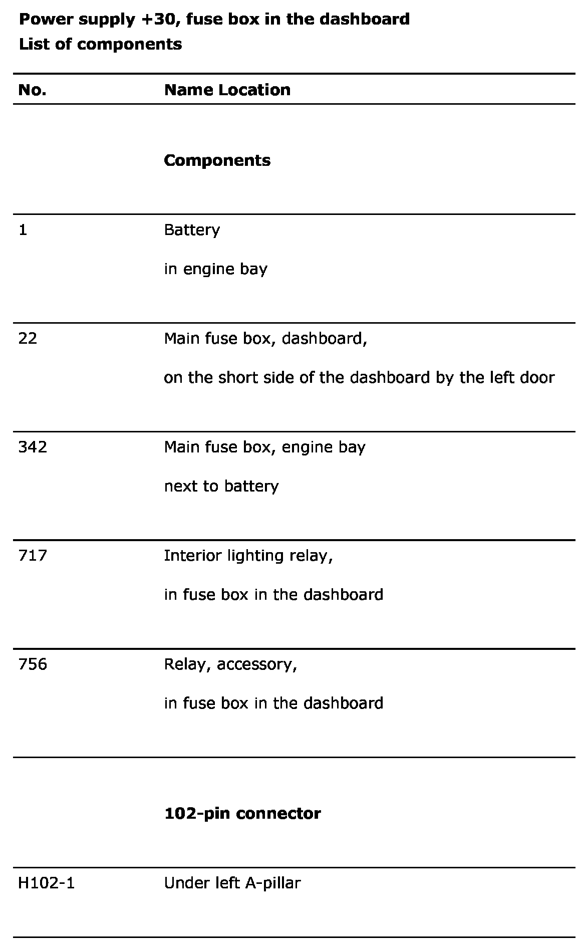 Power Supply +30, Fuse Box In the Dashboard
