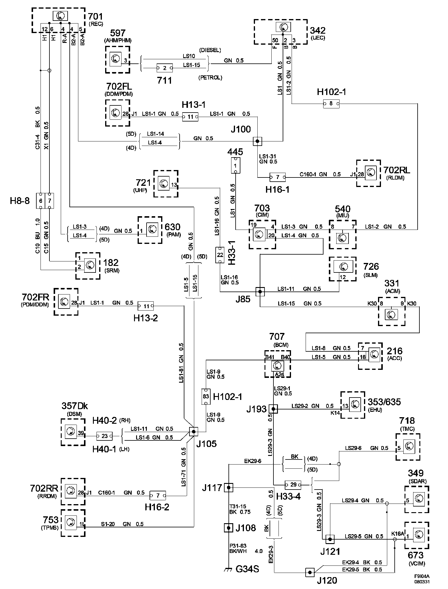 The diagrams for the power supplies that may be feeding this system (+30, +15, +54, +X, and +B) ) can be found at Power and Ground Distribution diagrams.