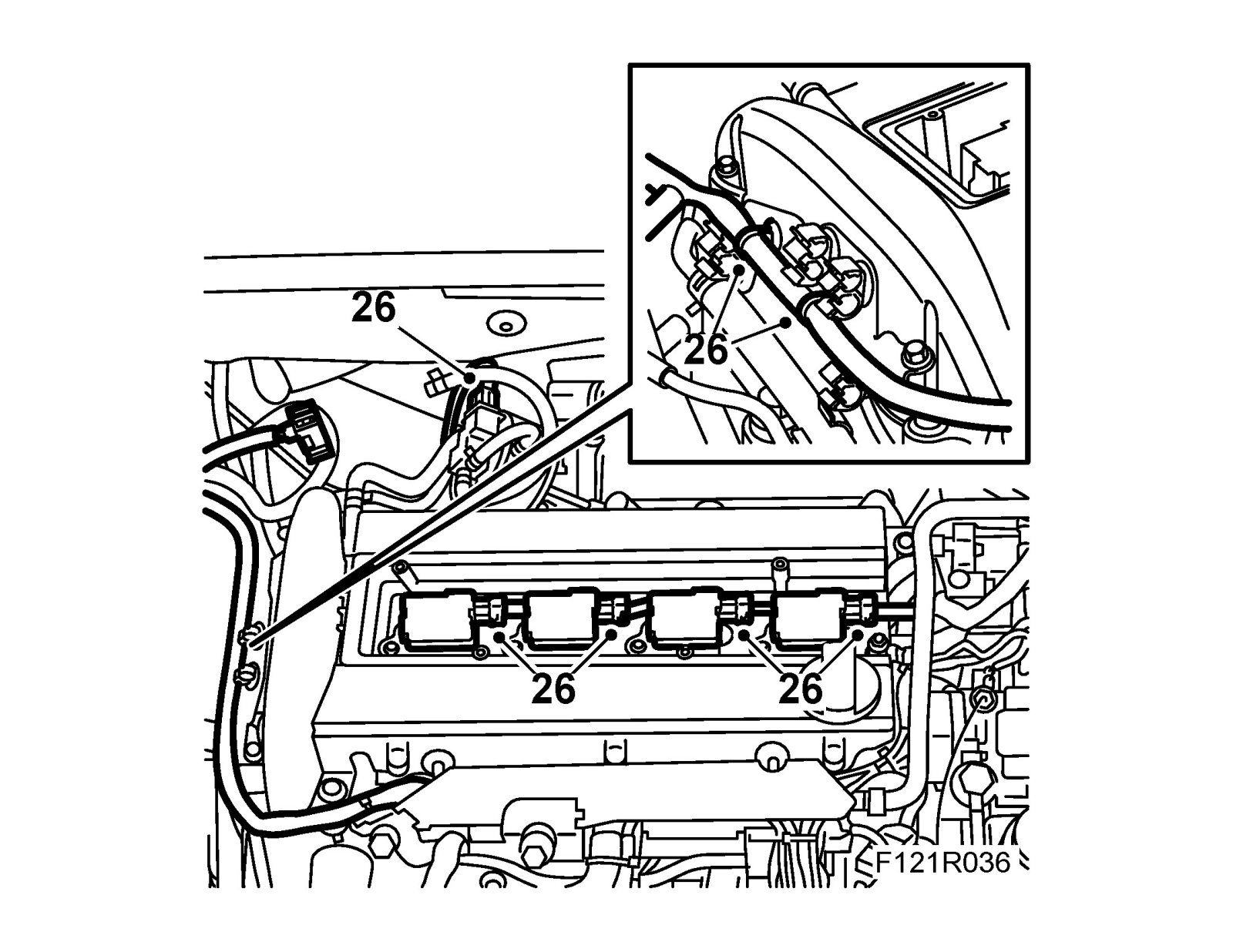 26. Unplug ignition coil connectors. Unplug connector to turbocharger solenoid valve and undo cable clips.
