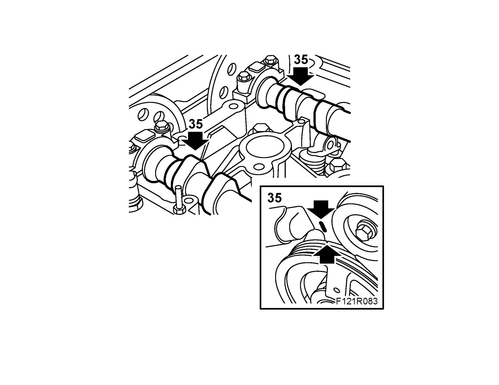 35. Zero the engine by turning the crankshaft clockwise until the mark on the crankshaft pulley agrees with the mark on the timing cover, cyl. 1 cams on intake and exhaust camshaft must be pointing in/up.