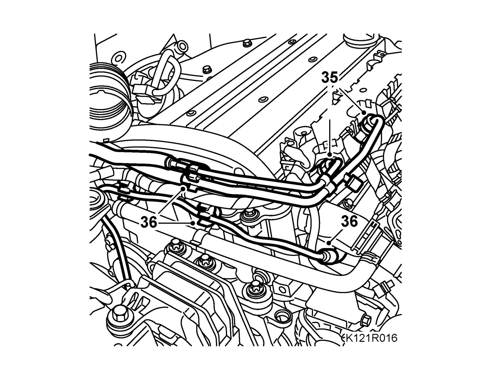 35. Release any pressure in the fuel system by carefully pressing the service valve needle. Collect any fuel spill. Detach both fuel lines from the fuel rail while gripping the lower nut. Plug the fuel lines. Use 82 92 948 Plugs, A/C system assy.