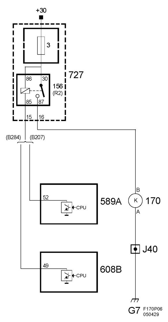 The compressor clutch is activated through a voltage feed from relay 156 in the underhood electric centre (727) and is grounded through grounding point G7.