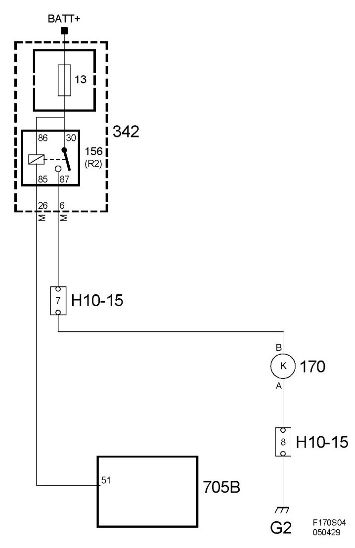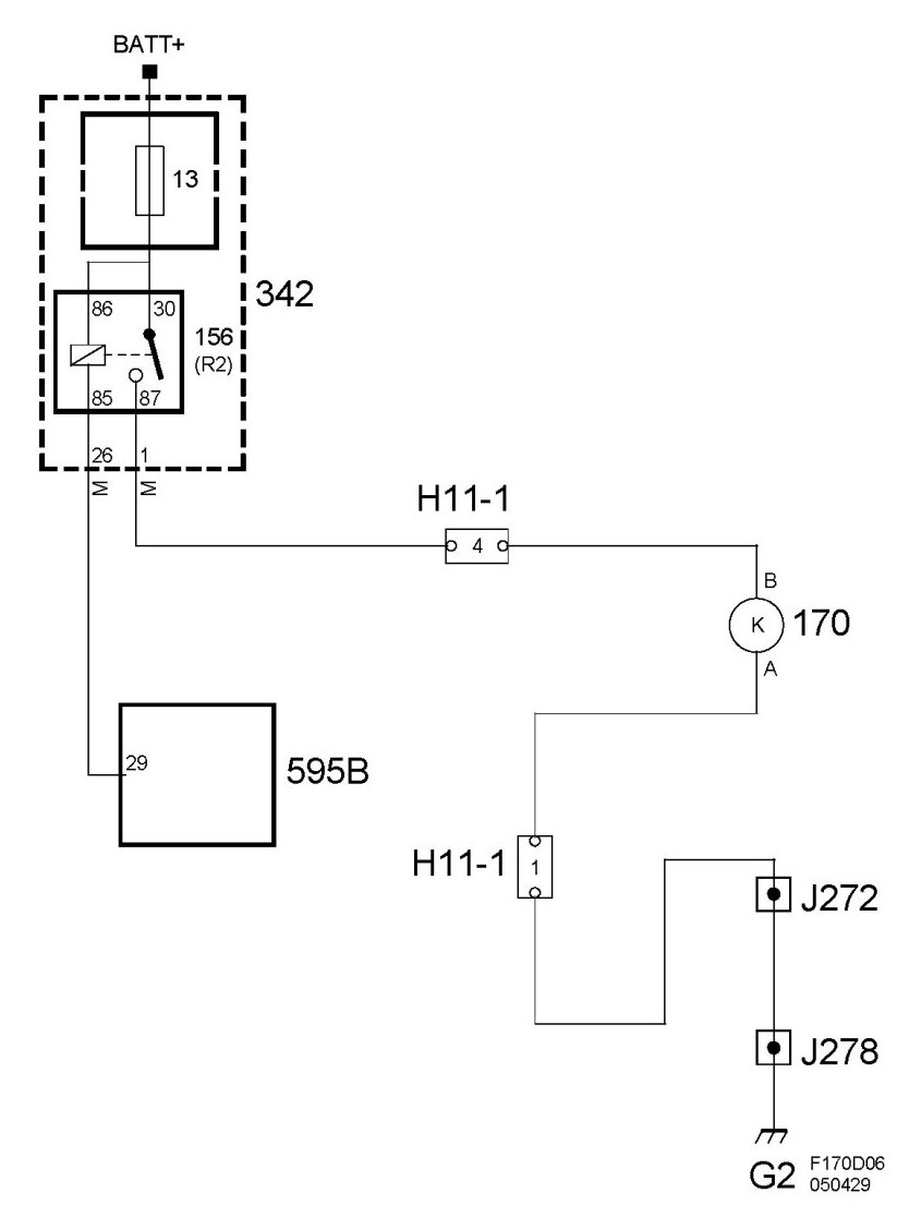 The compressor clutch is activated through a feed from relay 156 in the engine bay main fuse box (342) and is connected to ground through grounding point G2.