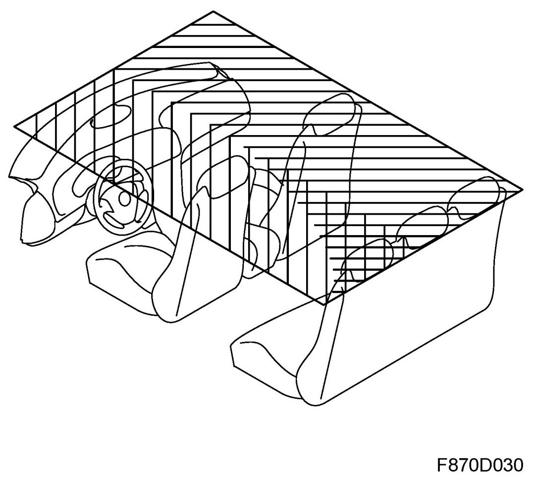 If the calculated temperature at the head height of the driver is less than what the driver set using the ACC unit's temperature knob and the outside temperature is less than about 6 degrees C, air distribution will be dependent on coolant temperature unit the defrost/floor mode has been assumed. See illustration.