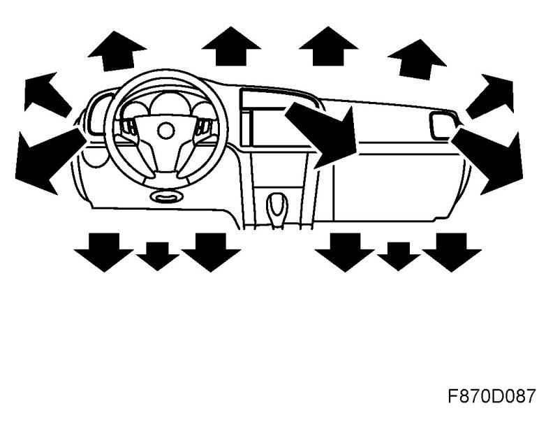 When the driver zone requires warmth, defrost+floor is selected; when cooling is required, the panel damper is also opened. If rapid cooling is required, the air distributed to the defroster is reduced, and if necessary also the air to the floor vents, increasing the flow of air through the panel vents. When the car is started in cold weather, defrost only is selected initially. Once the coolant has reached a temperature of 35 degrees C, the floor damper will start to open. At 45 degrees C, the floor damper opens more rapidly and the defroster damper is closed slightly to distribute more air to the foot wells.