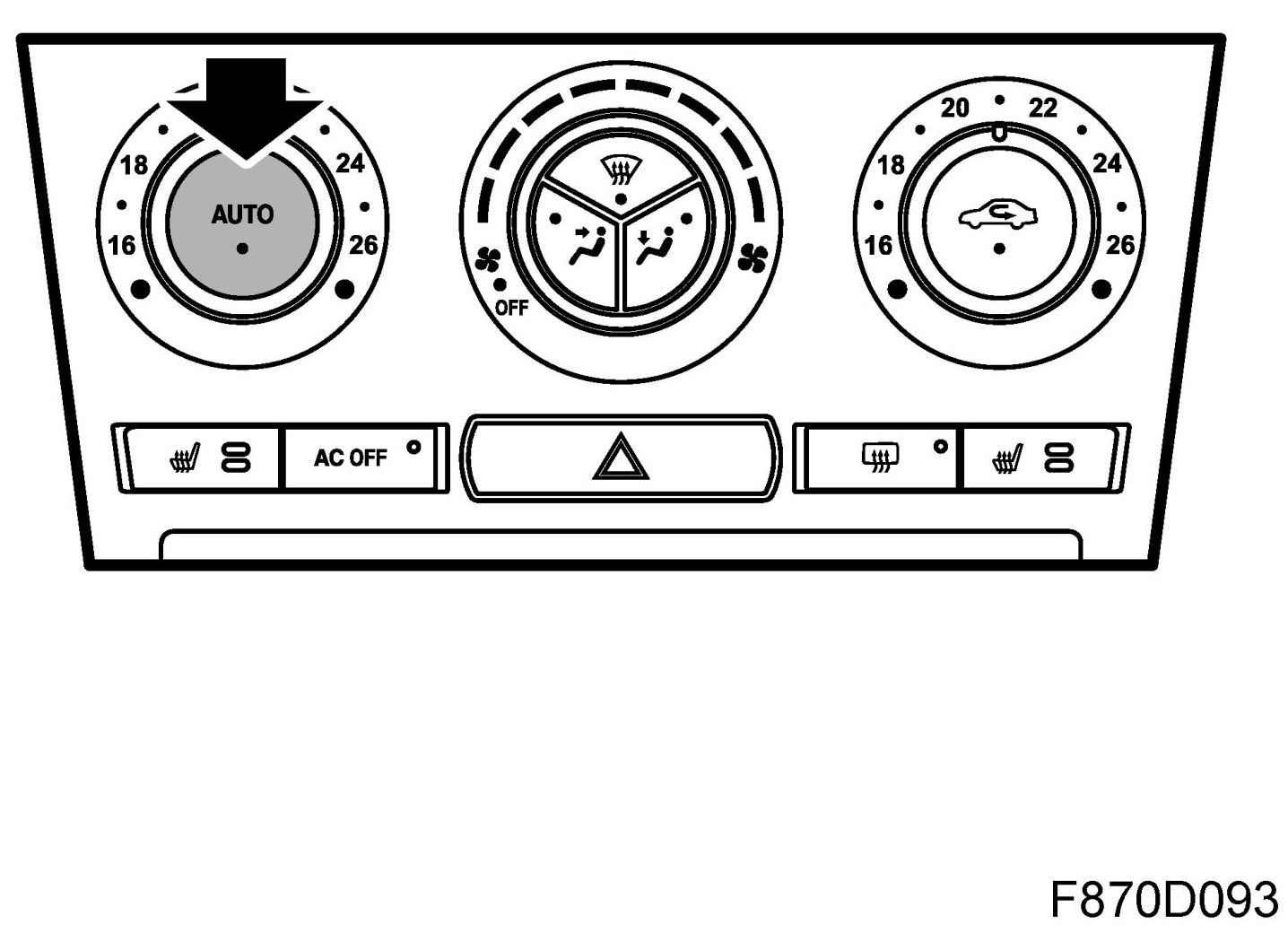All functions are automatically regulated to the set temperature. The LED in the AUTO button illuminates and confirms that the AUTO function is active. AC OFF, electrically heated rear window, recirculation, heated seats and temperature up or down can be selected without AUTO being deactivated.