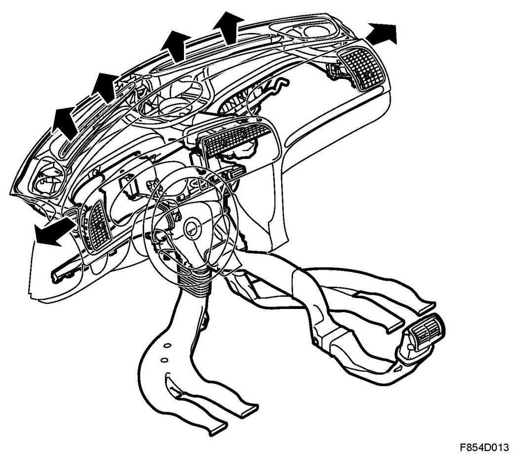 The climate control unit directs air from the air distribution damper to the defroster, panel or floor vents. From the air distribution damper, air is directed via a number of outlets to different vents located throughout the cabin.