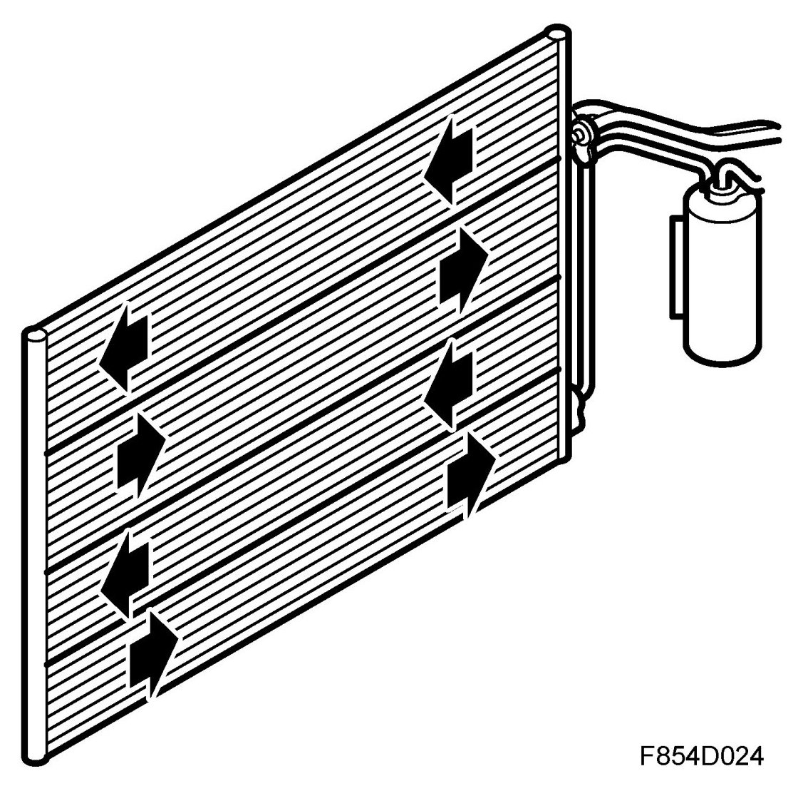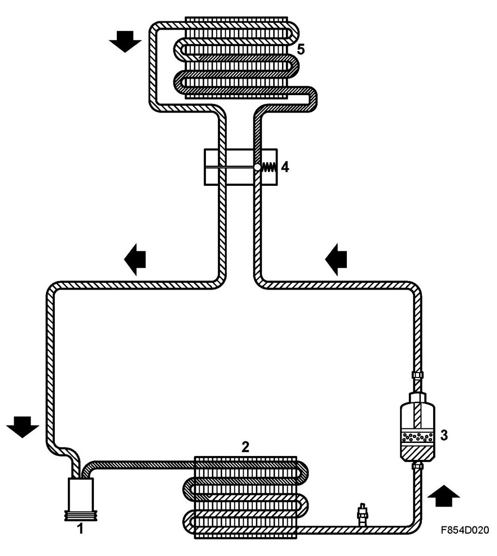 The evaporator, which is located in the climate control unit, consists of a heat exchanger (cabin air/refrigerant) through which refrigerant via through a pipe system equipped with cooling fins.