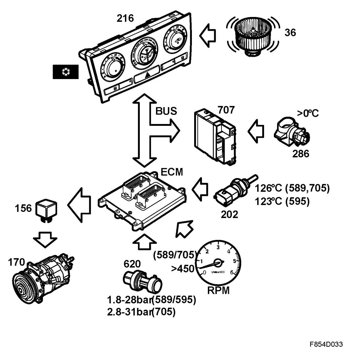 Pressure in the A/C system is measured with a pressure sensor mounted on the A/C pipe on the RH side of the condenser. The pressure sensor is connected to the engine control module which receives pressure information. The information is used to start or stop the compressor and radiator fan adjustment.