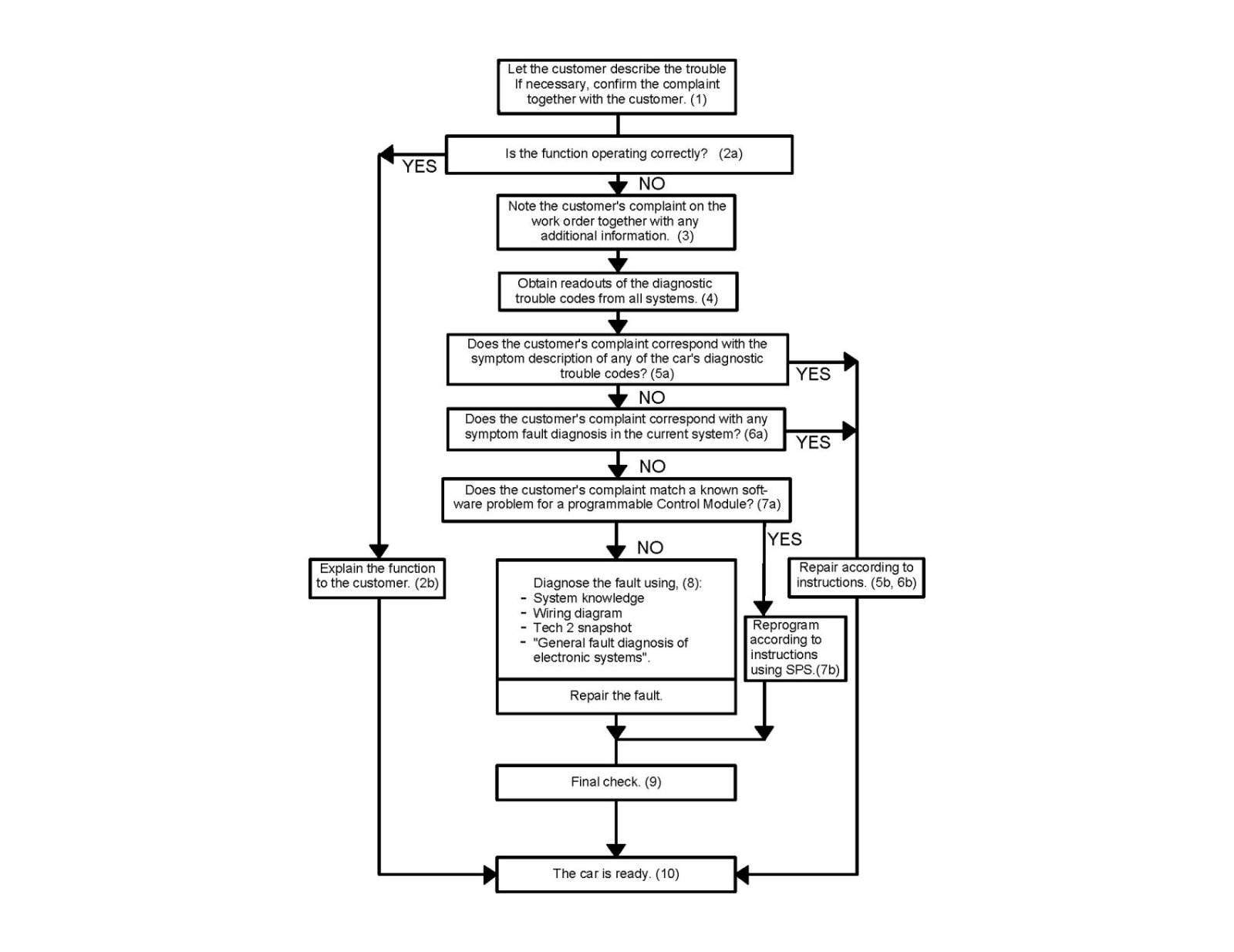 Saab's fault diagnosis strategy assumes that the technician is familiar with the customer's description of the problem. So note the customer's complaint and any other observations on the job sheet.