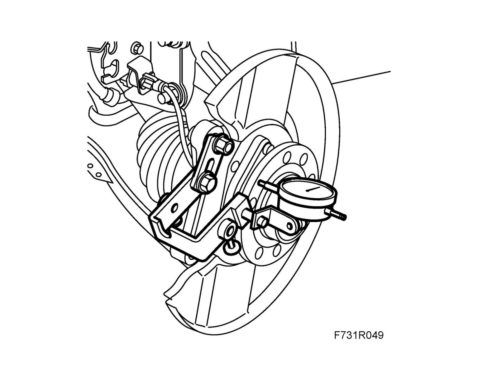 8. Fit 89 96 639 Gauge, brake disc on the upper mounting lug of the brake caliper with an M10 nut and bolt. Fit a 83 90 288 Holder, dial gauge and 78 40 622 Dial indicator.