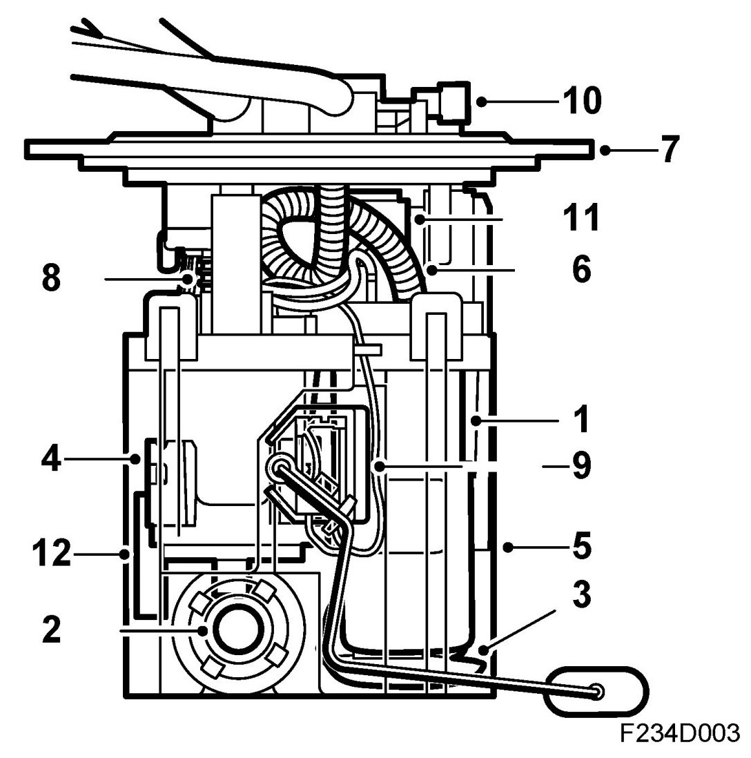 The fuel pump is located inside a plastic reservoir that is clamped between the top and bottom of the fuel tank and located centrally by protrusions in the bottom of the tank and at the top by the pump cover. The pump is mounted in the tank by screwing the pump cover into a screw ring on the outside of the tank. Movement in the tank is taken up by the fuel pump spring element.