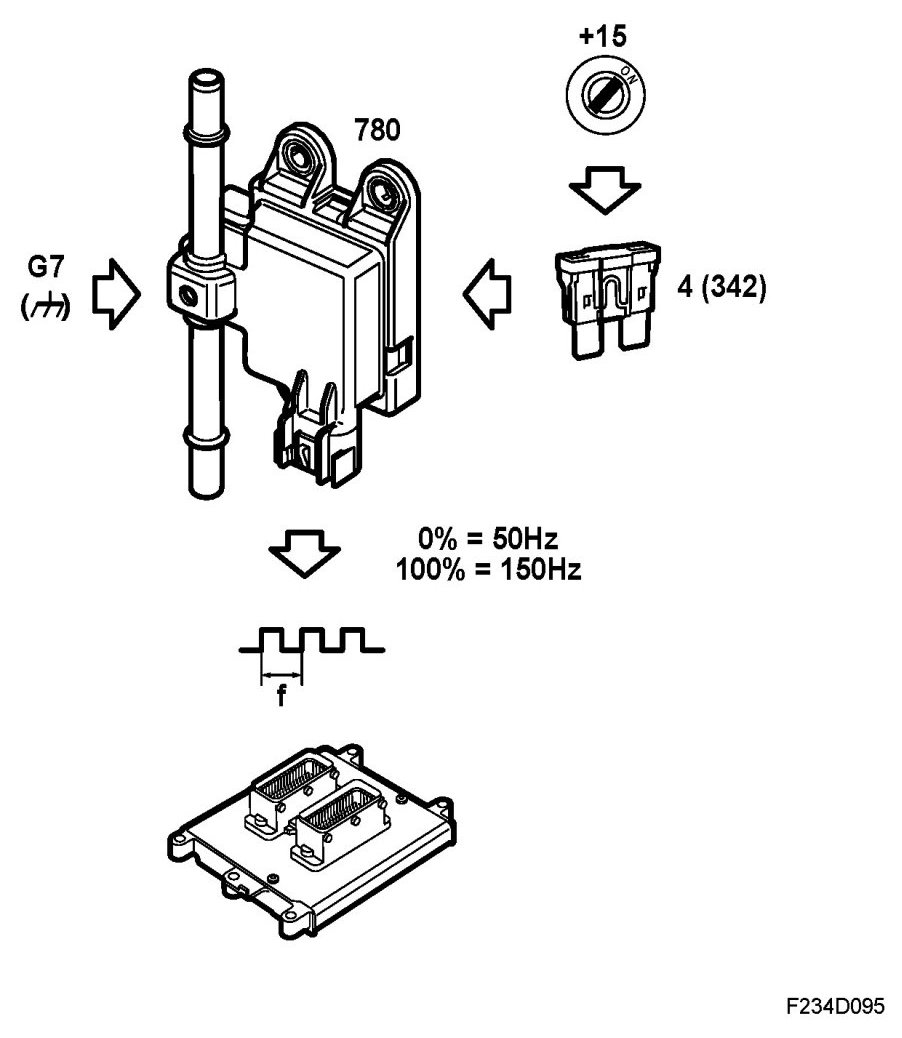 The ethanol sensor is supplied voltage with +15 from fuse 8 in the engine bay's electrical centre 727 and is grounded via crimp J212 in grounding point G1. A signal whose frequency forwards the information to the ECM is sent from the sensor. The waveform of the signal is the square type. Signal frequency varies with the fuel's ethanol content, 0% ethanol content produces 50 Hz, while 100% ethanol content produces 150 Hz. If water content that is too high is detected in the fuel then the output signal's frequency becomes 190 Hz. In the event of an internal fault in the sensor the frequency is set to about 170 Hz.