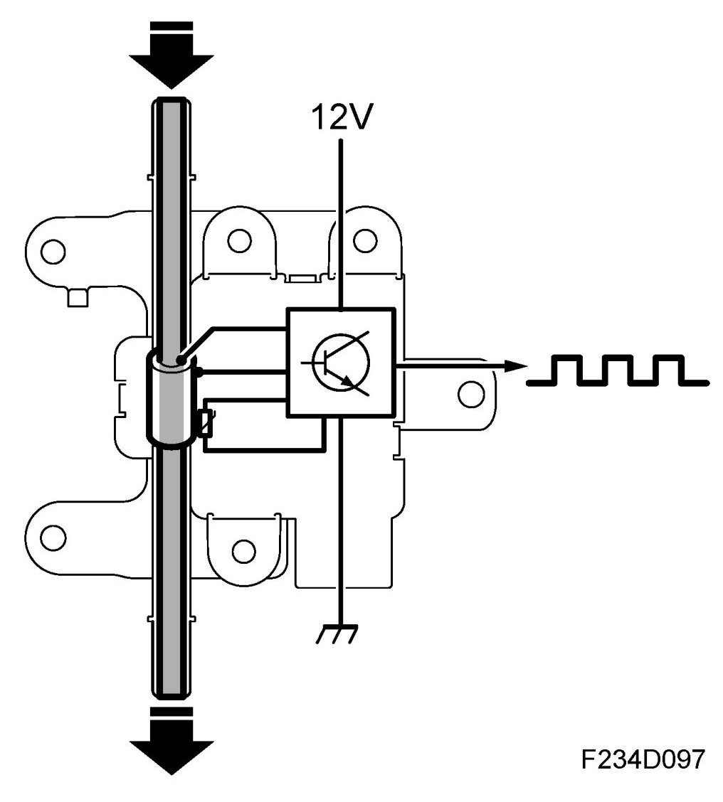 The sensor has no moving parts and is the flow sensor type. It consists mainly of a measuring element located in the fuel throughput, a temperature sensor and a microprocessor.