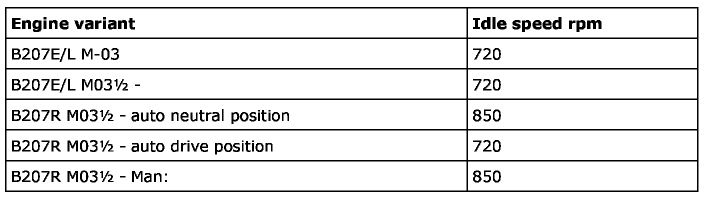 The normal idle speed is shown in the table below but if necessary can be increased to 950 rpm. This can be done e.g. at high alternator load or high power steering assistance required. Immediately after starting, the idle speed is always increased and falls after a while to the normal idle speed.