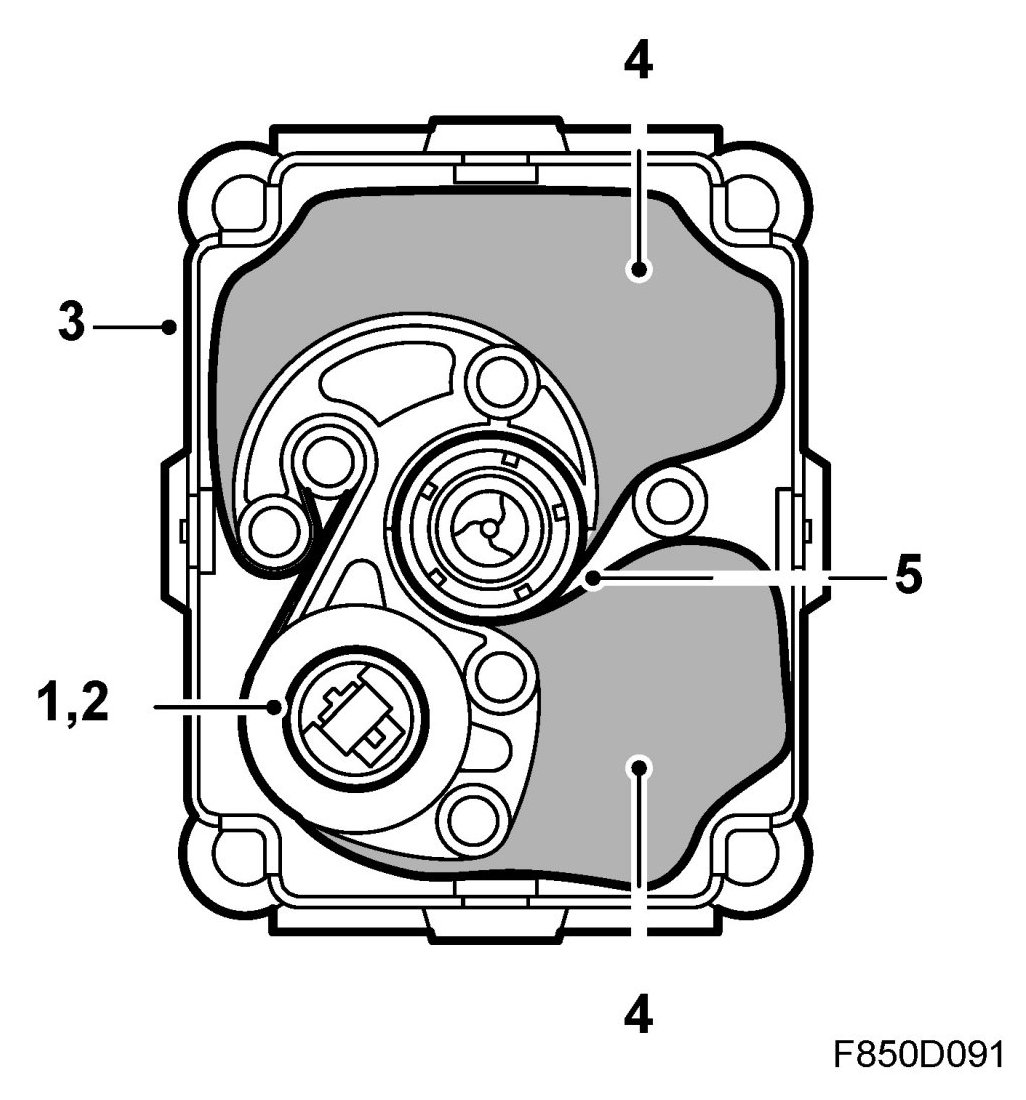 The contact roller consists of one fixed and one moving part. A spiral plastic tape with eight embedded leads is fitted between the fixed and moving part. The contact roller forms a connection between a circuit board in the CIM and the steering wheel. Four of the leads are connected to the driver airbag.