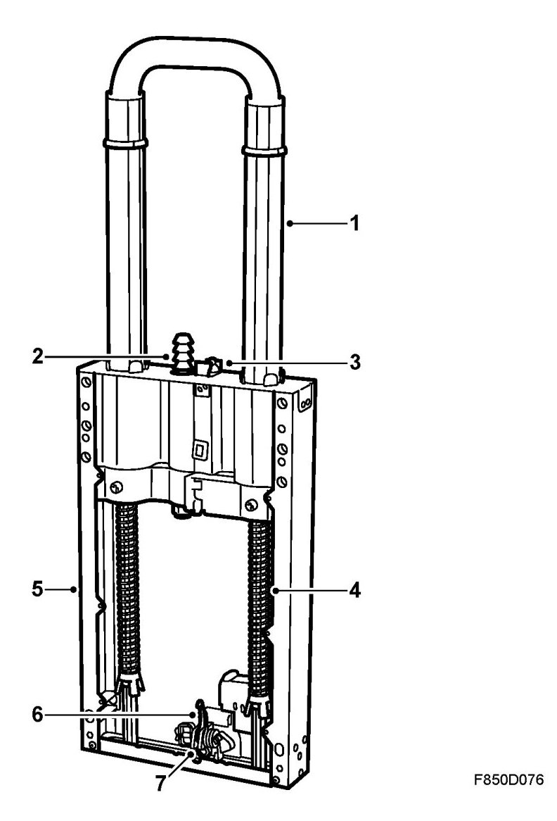 On manual activation of the roll bar, the upper lock hook (3) must first be pressed down before the roll bar can be returned to the down position. The lower lock hook (6) locks the bow in its down position.