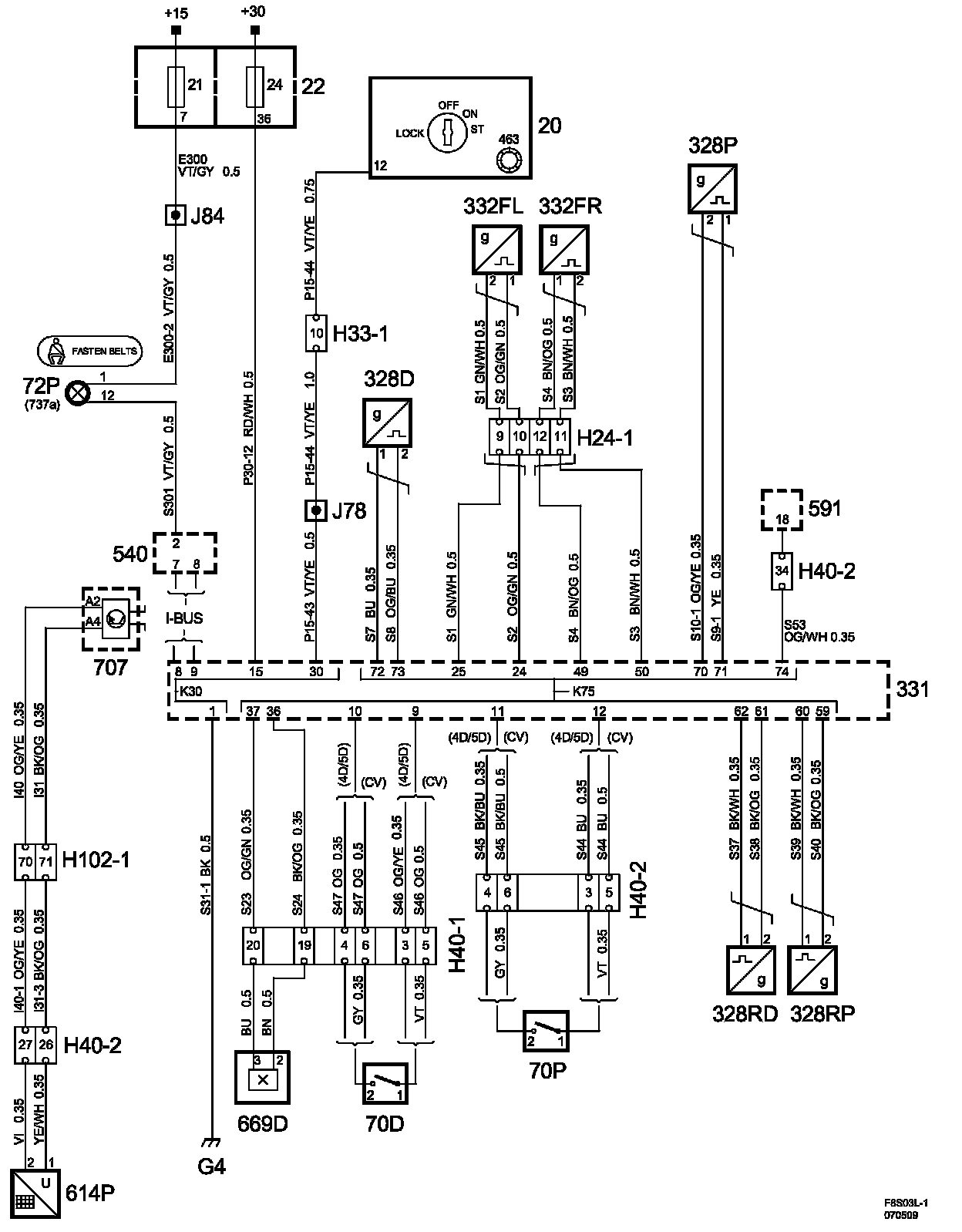 The diagrams for the power supplies that may be feeding this system (+30, +15, +54, +X, and +B) ) can be found at Power and Ground Distribution diagrams.