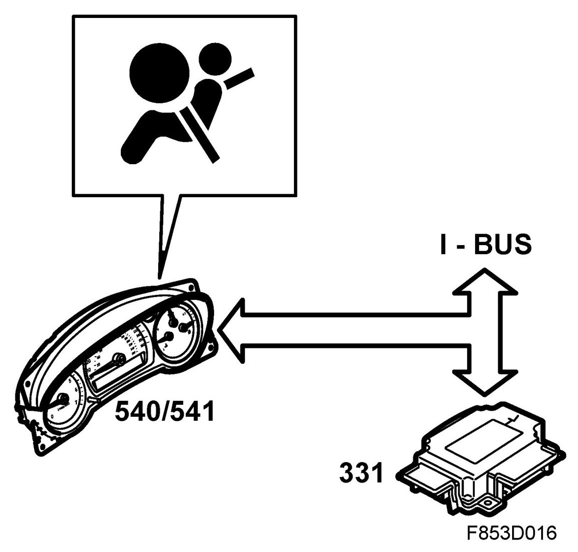 In the event of an airbag system fault, the airbag control module transmits a bus message (Display text), which activates a warning message in SID (Airbag fault, contact service), the airbag warning lamp and an audible warning in the audio system.