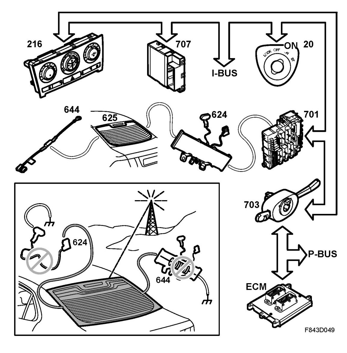 4D The bus message "Demist, request from ACC" is used by REC, which activates rear window relay 113. B+ is then fed from REC pin 2, which in turn is connected to the antenna amplifier. In the antenna amplifier current passes through a coil with low resistance and then on to the rear window heating element before being grounded via an antenna filter (coil). The coils on both sides are intended to prevent high-frequency signals (88-108 MHz) from being grounded and then directed out through the combined rear window/antenna.
