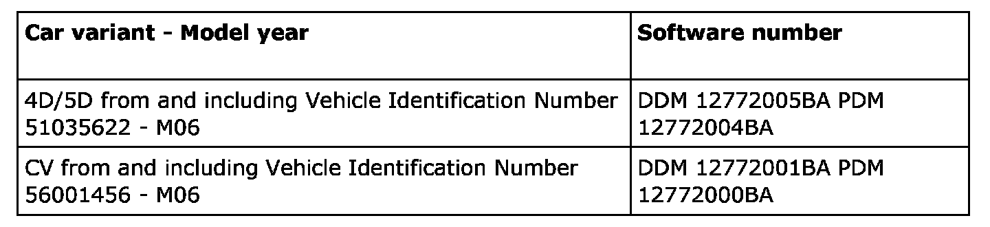 Connect Tech 2 (version 126.000 or later) and perform the update. The software is available on IRIS from and including TIS2000 edition 2006-3 update 1. Add the door control module with Tech 2 under the menu, All - Add/Remove. Check the function.