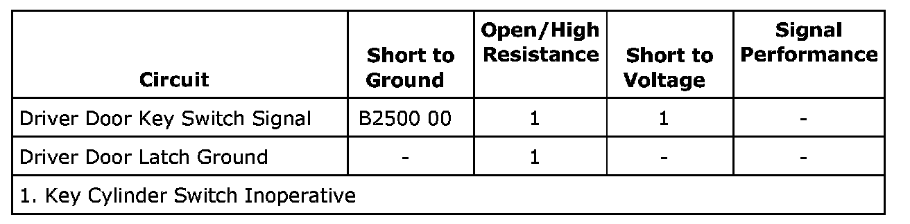 The driver window switch monitors the voltage level of the key switch unlock signal circuit. When the key is inserted into the driver door key cylinder and turned to the Unlock position, a switch within the driver door latch closes causing the voltage to drop within the key switch unlock signal circuit. The driver window switch will detect the drop in voltage and will send a serial data message to the BCM commanding all the doors to unlock.