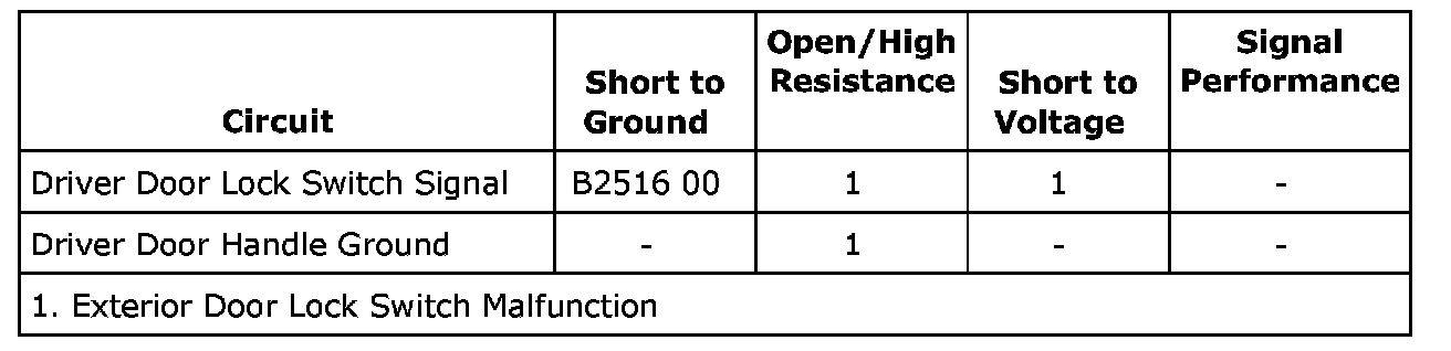 The keyless entry control module detects the driver door lock switch signal circuit is shorted to ground for greater than 45 seconds.