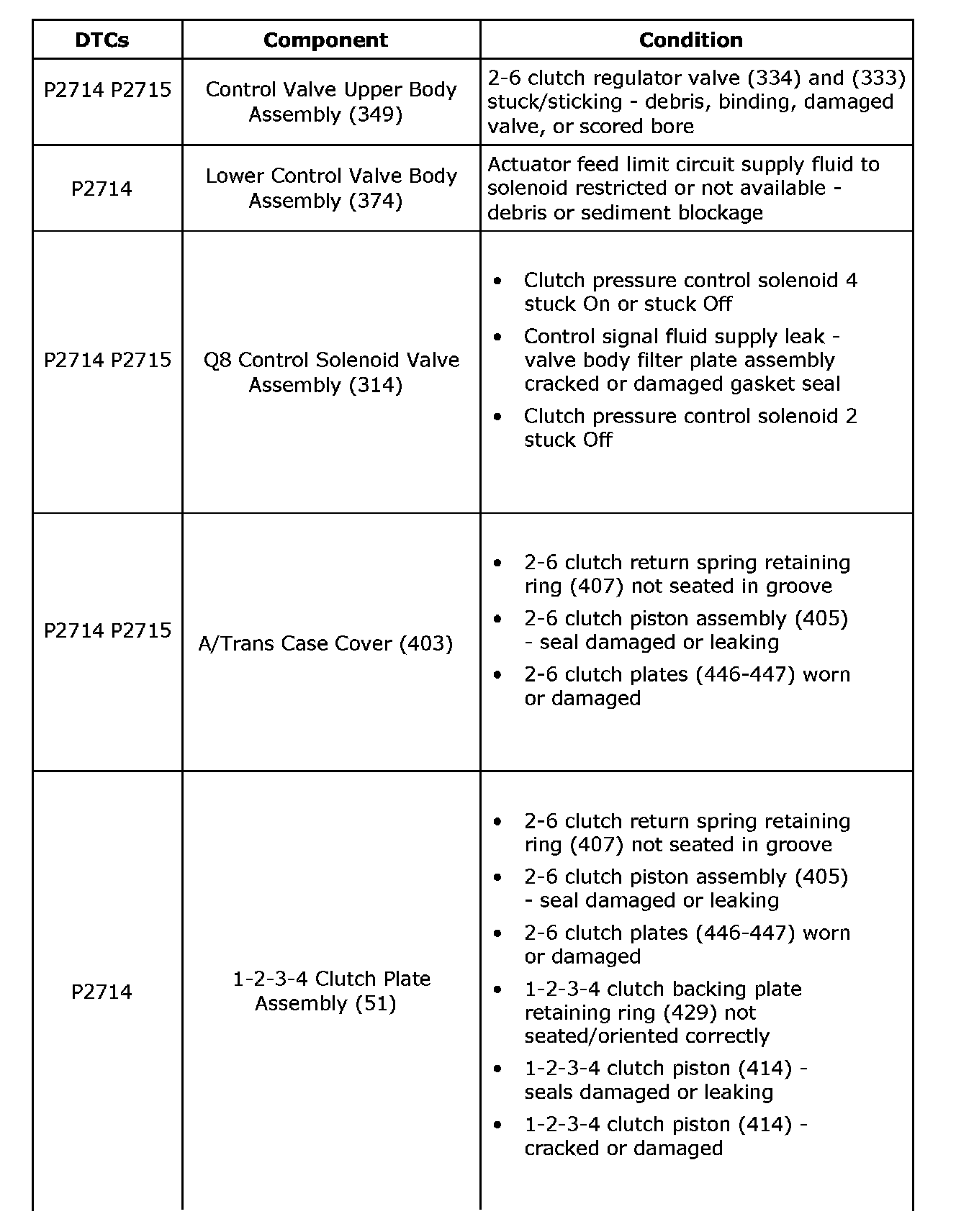 6. Listed in the table below, are conditions for each component that could set DTC P2714 or P2715. Carefully inspect each component for that condition. Repair or replace as necessary.
