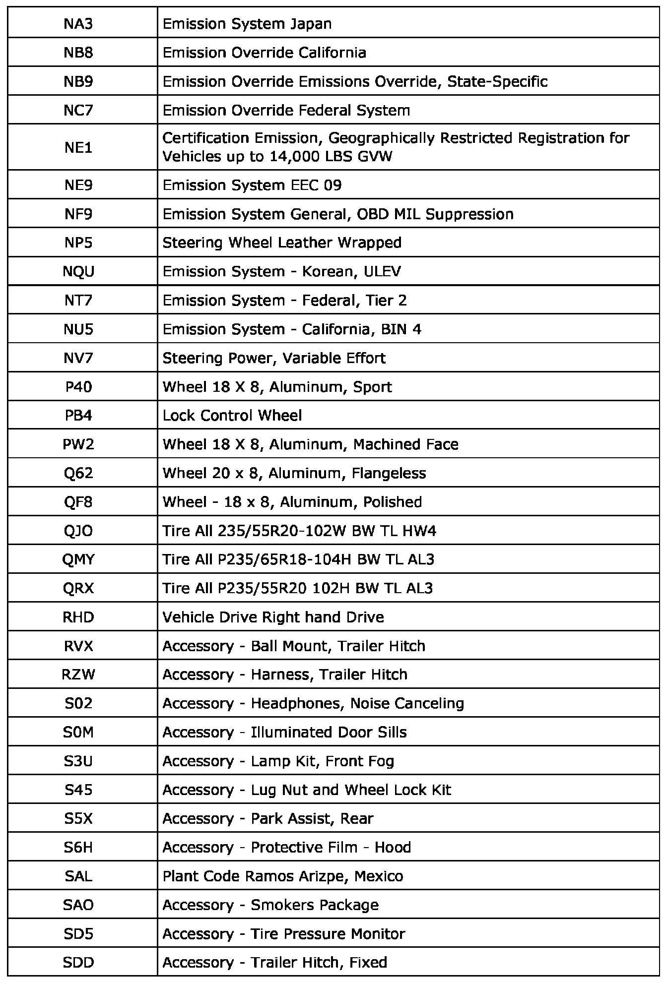 RPO Code List