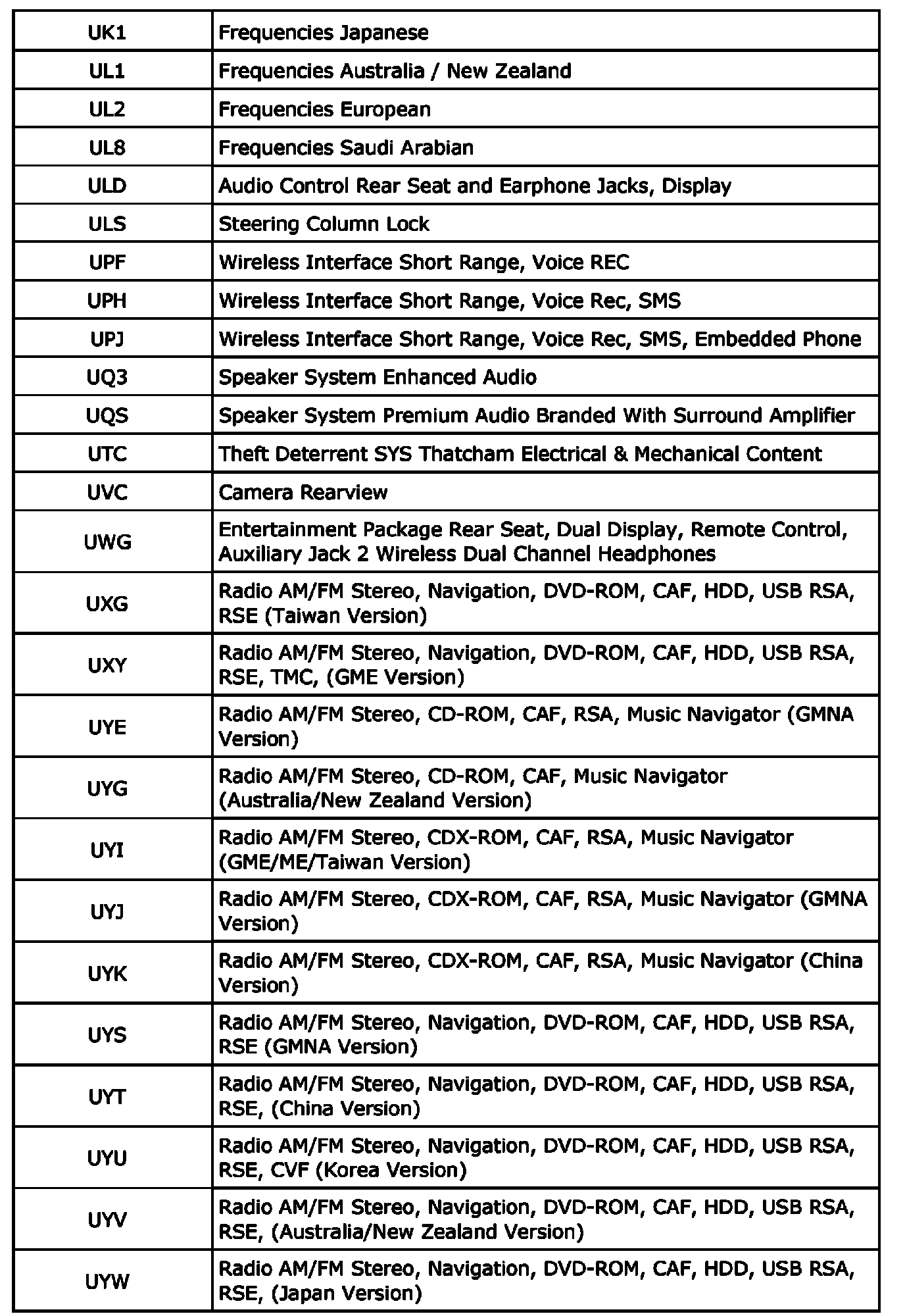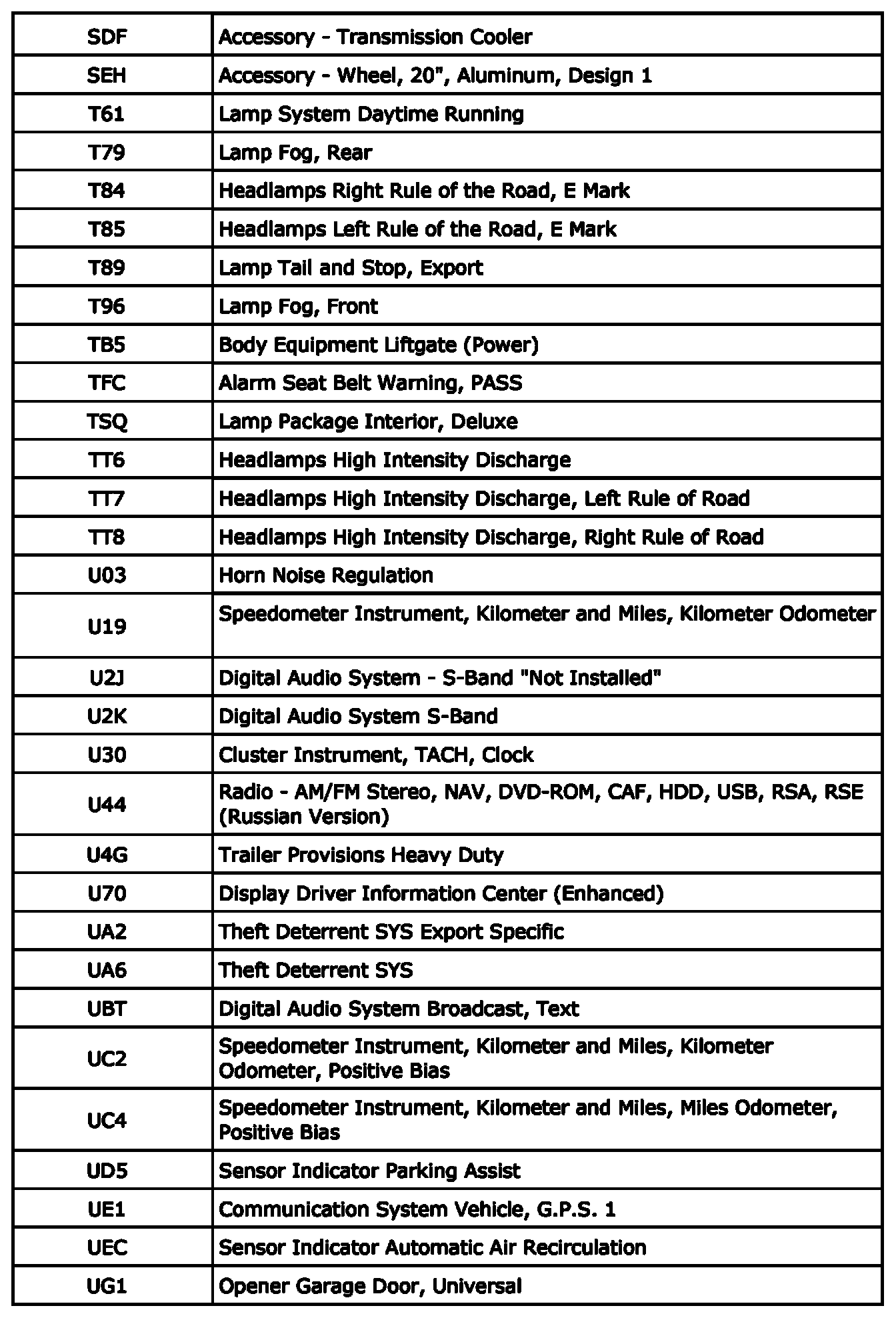 The following table provides the description of the Regular Production Option (RPO) codes that are available on the vehicle. The vehicles RPO list is printed on the Service Parts Identification Label.