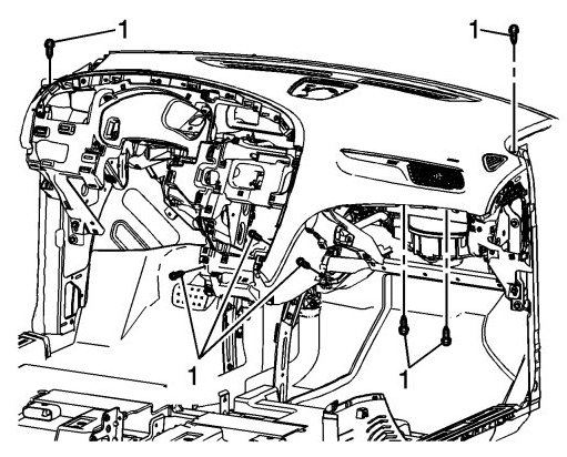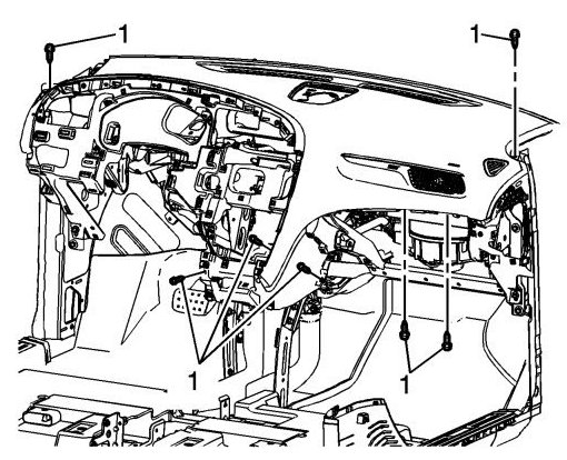 15. Remove the 7 bolts/screws (1) securing the instrument panel assembly to the vehicle.